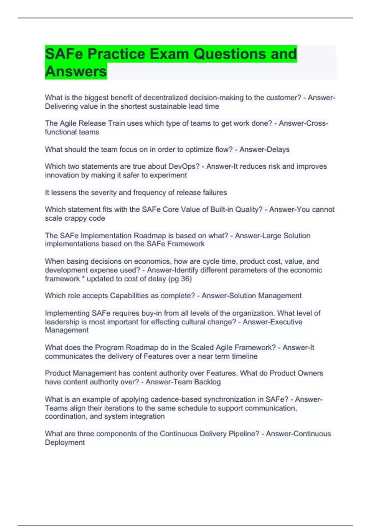 SAFe Practice Exam Questions and Answers