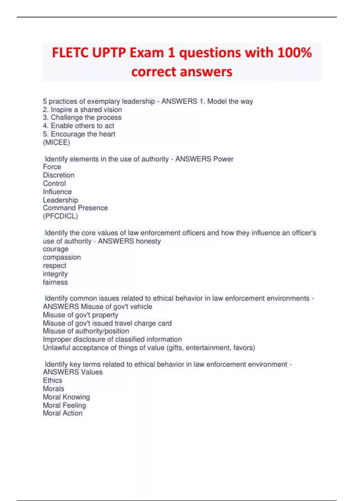 FLETC UPTP Exam 1 questions with 100% correct answers 5 practices of exemplary leadership - ANSWERS 1. Model the way 2. Inspire a shared vision 3. Challenge the process 4. Enable others to act 5. Encourage the heart (MICEE) Identify elements in the use of authority - ANSWERS Power Force Discretion Control Influence Leadership Command Presence (PFCDICL) Identify the core values of law enforcement officers and how they influence an officer's use of authority - ANSWERS honesty courage compassion respect integrity fairness Identify common issues related to ethical behavior in law enforcement environments - ANSWERS Misuse of gov't vehicle Misuse of gov't property Misuse of gov't issued travel charge card Misuse of authority/position Improper disclosure of classified information Unlawful acceptance of things of value (gifts, entertainment, favors) Identify key terms related to ethical behavior in law enforcement environment - ANSWERS Values Ethics Morals Moral Knowing Moral Feeling Moral Action Identify influences that affect ethical decision making - ANSWERS Peer pressure slippery slope rationalization noble cause noble cause corruption street level bureaucracy hypervigilance victim-based thinking continuum of compromise (Acts of Omission-failure, Acts of Commission/Administrative-failure of agency policy, Acts of Commission/Criminal-committing criminal acts) (Pink Slippers Running Near Super Hot Victims) Identify critical thinking concepts & tools associated with making ethical decisions - ANSWERS Toolset Skillset Mindset Heartset Moral Courage IDWAE - ANSWERS Inquire Define Weigh Act Evaluate Identify essential elements of ethically serving & protecting a culturally diverse U.S. - ANSWERS Culture Cultural Competency Stereotypes Racial Profiling Intercultural Communication Competency Procedural Justice (CCSRIP) Identify elements of sexual harassment - ANSWERS Quid Pro Quo: something for something -Tangible Employment Action: significant change in employment status Hostile Work Environment (ex. verbal, non-verbal, graphic, physical) Branches of Government - ANSWERS Legislative, Executive, Judicial 1st Amendment - ANSWERS Freedom of Religion, Speech, Press, Assembly, & Petition 4th Amendment - ANSWERS Freedom from unreasonable searches and seizures exclusionary rule - ANSWERS a law that prohibits the use of illegally obtained evidence in a criminal trial 5th Amendment - ANSWERS Criminal Proceedings Due Process (Fundamental Fairness) Eminent Domain Double Jeopardy Protection from Self-incrimination 6th Amendment - ANSWERS Right to a fair, speedy trial 8th Amendment - ANSWERS excessive bail, cruel and unusual punishment 14th Amendment - ANSWERS Declares that all persons born in the U.S. are citizens and are guaranteed EQUAL PROTECTION of