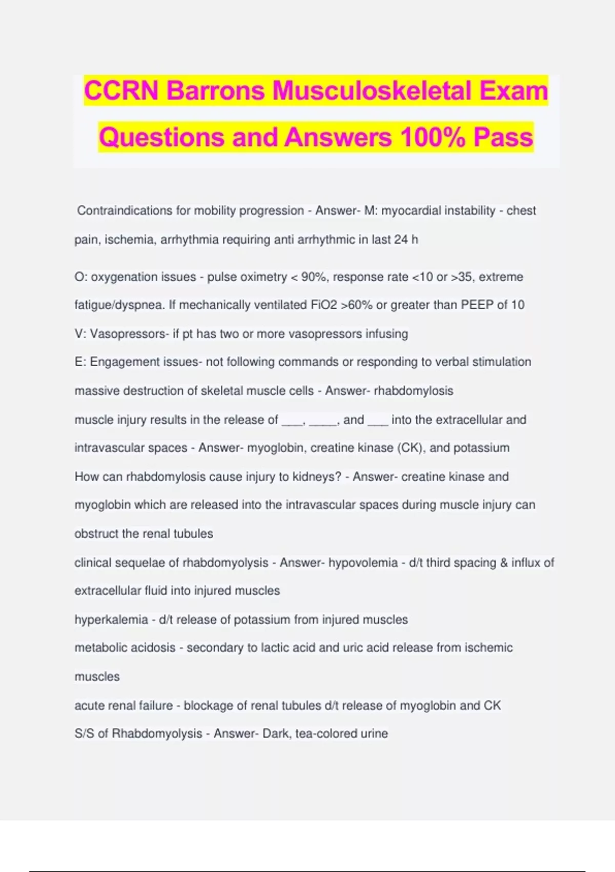 CCRN Barrons Musculoskeletal Exam Questions and Answers 100% Pass Contraindications for mobility progression - Answer- M: myocardial instability - chest pain, ischemia, arrhythmia requiring anti arrhythmic in last 24 h O: oxygenation issues - pulse oximetry < 90%, response rate <10 or >35, extreme fatigue/dyspnea. If mechanically ventilated FiO2 >60% or greater than PEEP of 10 V: Vasopressors- if pt has two or more vasopressors infusing E: Engagement issues- not following commands or responding to verbal stimulation massive destruction of skeletal muscle cells - Answer- rhabdomylosis muscle injury results in the release of ___, ____, and ___ into the extracellular and intravascular spaces - Answer- myoglobin, creatine kinase (CK), and potassium How can rhabdomylosis cause injury to kidneys? - Answer- creatine kinase and myoglobin which are released into the intravascular spaces during muscle injury can obstruct the renal tubules clinical sequelae of rhabdomyolysis - Answer- hypovolemia - d/t third spacing & influx of extracellular fluid into injured muscles hyperkalemia - d/t release of potassium from injured muscles metabolic acidosis - secondary to lactic acid and uric acid release from ischemic muscles acute renal failure - blockage of renal tubules d/t release of myoglobin and CK S/S of Rhabdomyolysis - Answer- Dark, tea-colored urine Low urine output Positive on dipstick for hemoglobin, but no RBC on UA Myoglobin in urine Elevated CK >10,000 U/L Muscle cramping Arrhythmias treatment of rhabdomylosis - Answer- fluids (NS) to maintain UOP of ~300 ml/h sodium bicarbonate infusion to alkalinize the urine administer mannitol monitor for and treat hyperkalemia therapy should continue until the urine is cleared of any myoglobin elevated pressure within the muscle fascia whi