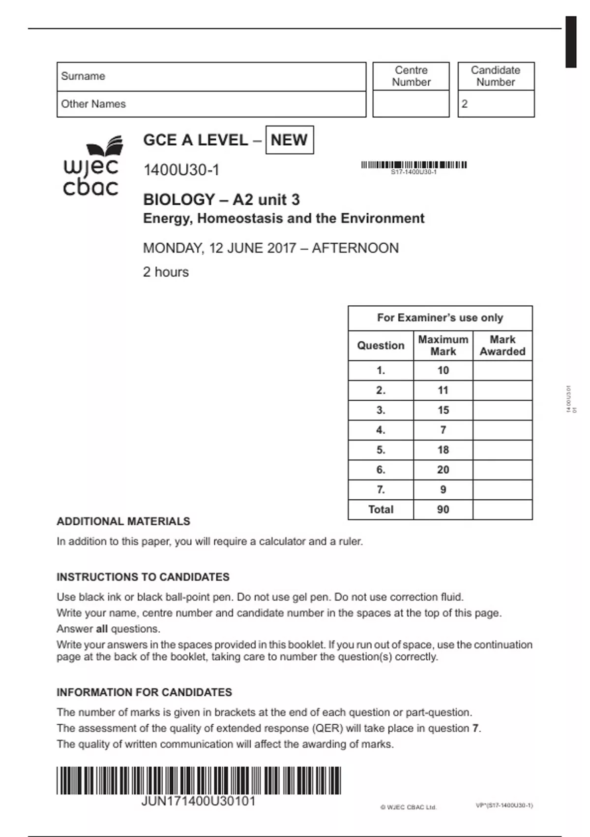 GCE A LEVEL – NEW 1400U30-1 BIOLOGY – A2 unit 3 Energy, Homeostasis and the Environment