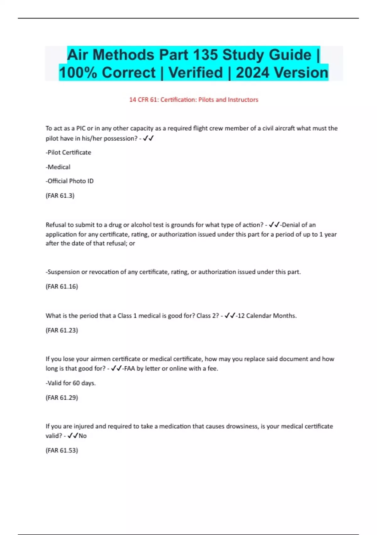Air Methods Part 135 Study Guide | 100% Correct | Verified | 2024 Version 14 CFR 61: Certification: Pilots and Instructors To act as a PIC or in any other capacity as a required flight crew member of a civil aircraft what must the pilot have in his/her possession? - -Pilot Certificate -Medical -Official Photo ID (FAR 61.3) Refusal to submit to a drug or alcohol test is grounds for what type of action? - -Denial of an application for any certificate, rating, or authorization issued under this part for a period of up to 1 year after the date of that refusal; or -Suspension or revocation of any certificate, rating, or authorization issued under this part. (FAR 61.16) What is the period that a Class 1 medical is good for? Class 2? - -12 Calendar Months. (FAR 61.23) If you lose your airmen certificate or medical certificate, how may you replace said document and how long is that good for? - -FAA by letter or online with a fee. -Valid for 60 days. (FAR 61.29) If you are injured and required to take a medication that causes drowsiness, is your medical certificate valid? - No (FAR 61.53) If you falsify your Pilot Duty Logs, what action can be taken against you? - Suspension of revocation of certificate (FAR 61.59) How long do you have to notify the FAA of a permanent change of address? - 30 Days (FAR 61.60) 14 CFR 91: General Operating & Flight Rules - A NASA ASRP form does not protect you in the case of what type(s) of offense(s)? - Accidents or criminal offenses (FAR 91.25) You receive a flight that requires you to fly greater than 100 NM from your base site. What information must you obtain prior to accepting this flight? - -Weather -Reports -Forecasts -Fuel requirements -Alternatives -Runways and Lengths (FAR 91.103) Why and how might you legally deviate from an accepted ATC clearance? - -Amended clearance is obtained -An emergency exist -The deviation is in response to a traffic alert (FAR 91.123) Your route of flight will take you directly over the parking lot of a local stadium hosting the MLB All Star Game. What type of restrictive airspace will overlay this event? Are you allowed to fly through this on a PR flight? On a patient flight? - There will be a TFR present over the event. Any sporting event with grater than 30,000 people, operations are prohibited within 3NM and 3000ft AGL. Medical Transportation operation may be except when warranted by the FAA administrator. (FAR 91.145) (99.7) What about flying directly over a stadium or sporting event is not listed in 91.145? Would a regular season game be protected as well? Where would you look to find the boundaries of such a protected area? - Stadiums with 30,000 people, operations are prohibited within 3NM and 3000ft AGL. NOTAMS (FAR 91.145) (99.7) During preflight you notice the airworthiness certificate is faded, torn, and unreadable. What actions must you take? Can you legally operate the aircraft? - No person may operate a civil aircraft unless the airworthiness certificate required by paragraph (a) of this section or a special flight authorization issued under §91.715 is displayed at the cabin or cockpit entrance so that it is legible to passengers or crew. (FAR 91.203) 14 CFR 135: Drug and Alcohol - If you refuse to take a drug or alcohol test, what regulatory and administrative actions can be taken against you? - -Denial of an application for any certificate