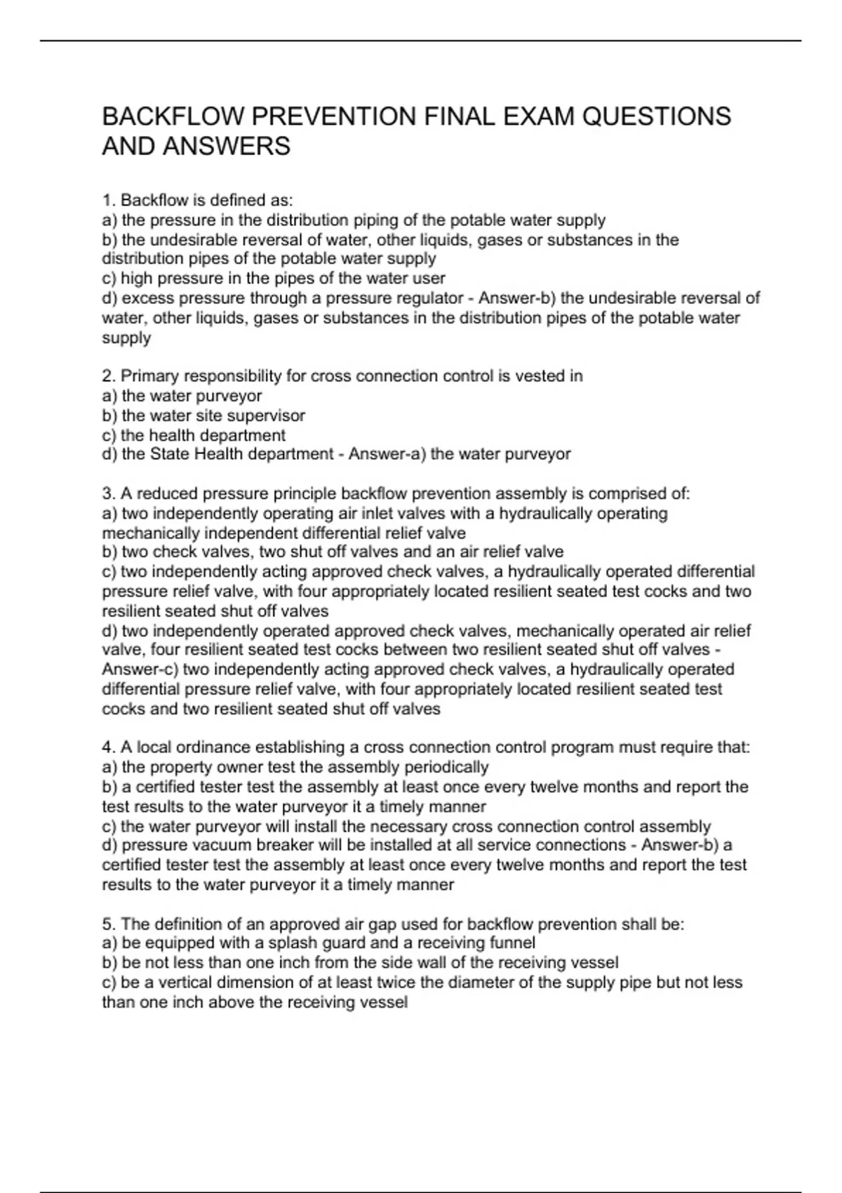 1. Backflow is defined as: a) the pressure in the distribution piping of the potable water supply b) the undesirable reversal of water, other liquids, gases or substances in the distribution pipes of the potable water supply c) high pressure in the pipes of the water user d) excess pressure through a pressure regulator - Answer-b) the undesirable reversal of water, other liquids, gases or substances in the distribution pipes of the potable water supply 2. Primary responsibility for cross connection control is vested in a) the water purveyor b) the water site supervisor c) the health department d) the State Health department - Answer-a) the water purveyor 3. A reduced pressure principle backflow prevention assembly is comprised of: a) two independently operating air inlet valves with a hydraulically operating mechanically independent differential relief valve b) two check valves, two shut off valves and an air relief valve c) two independently acting approved check valves, a hydraulically operated differential pressure relief valve, with four appropriately located resilient seated test cocks and two resilient seated shut off valves d) two independently operated approved check valves, mechanically operated air relief valve, four resilient seated test cocks between two resilient seated shut off valves - Answer-c) two independently acting approved check valves, a hydraulically operated differential pressure relief valve, with four appropriately located resilient seated test cocks and two resilient seated shut off valves 4. A local ordinance establishing a cross connection control program must require that: a) the property owner test the assembly periodically b) a certified tester test the assembly at least once every twelve months and report the test results to the water purveyor it a timely manner c) the water purveyor will install the necessary cross connection control assembly d) pressure vacuum breaker will be installed at all service connections - Answer-b) a certified tester test the assembly at least once every twelve months and report the test resu