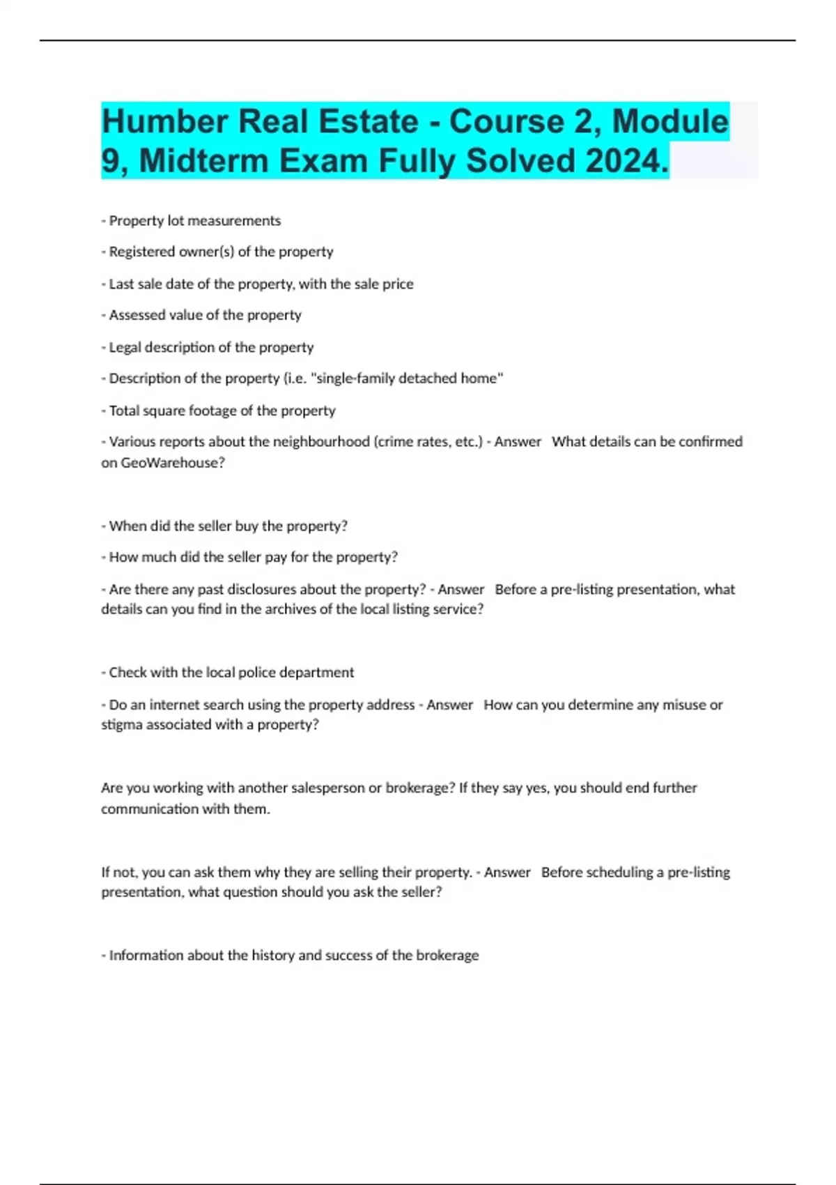 - Property lot measurements - Registered owner(s) of the property - Last sale date of the property, with the sale price - Assessed value of the property - Legal description of the property - Description of the property (i.e. "single-family detached home" - Total square footage of the property - Various reports about the neighbourhood (crime rates, etc.) - Answer What details can be confirmed on GeoWarehouse? - When did the seller buy the property? - How much did the seller pay for the property? - Are there any past disclosures about the property? - Answer Before a pre-listing presentation, what details can you find in the archives of the local listing service? - Check with the local police department - Do an internet search using the property address - Answer How can you determine any misuse or stigma associated with a property? Are you working with another salesperson or brokerage? If they say yes, you should end further communication with them. If not, you can ask them why they are selling their property. - Answer Before scheduling a pre-listing presentation, what question should you ask the seller? - Information about the history and success of the brokerage