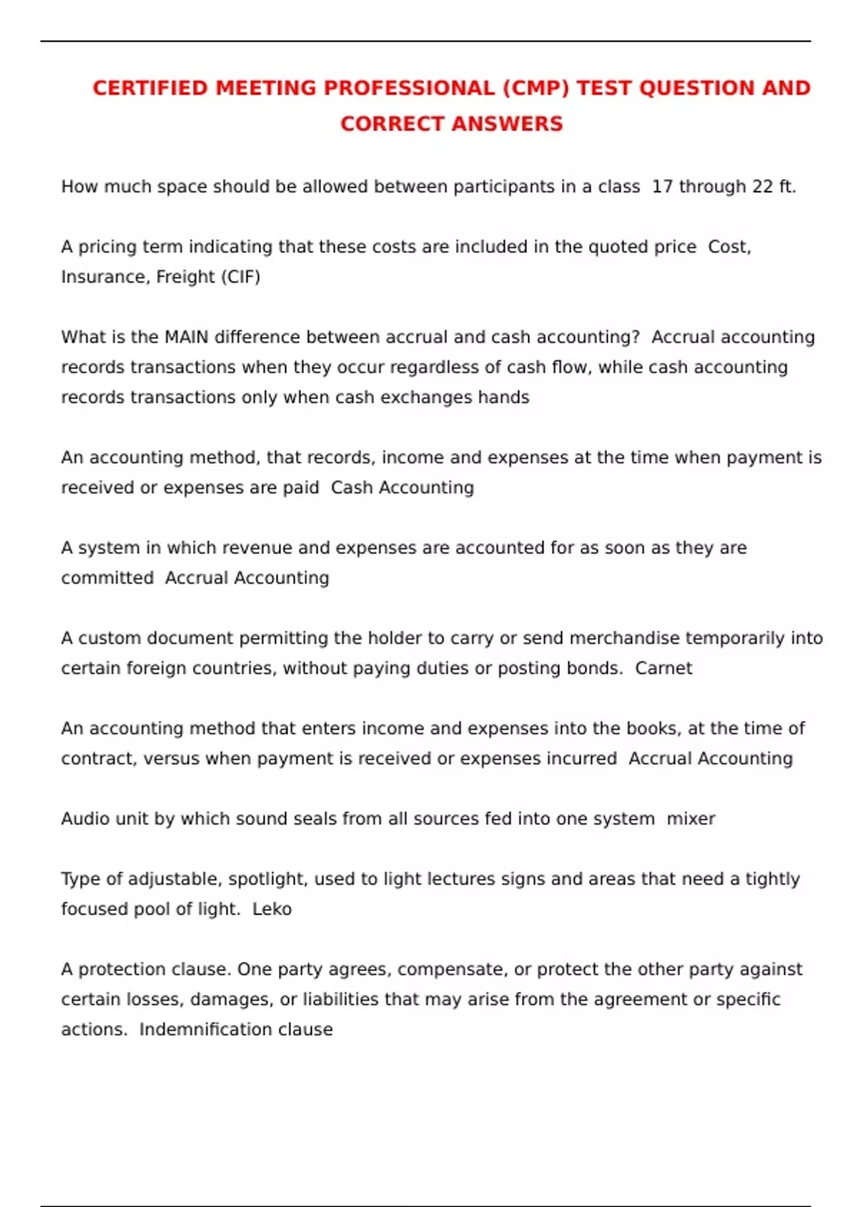 CERTIFIED MEETING PROFESSIONAL (CMP) TEST QUESTION AND CORRECT ANSWERS How much space should be allowed between participants in a class 17 through 22 ft. A pricing term indicating that these costs are included in the quoted price Cost, Insurance, Freight (CIF) What is the MAIN difference between accrual and cash accounting? Accrual accounting records transactions when they occur regardless of cash flow, while cash accounting records transactions only when cash exchanges hands An accounting method, that records, income and expenses at the time when payment is received or expenses are paid Cash Accounting A system in which revenue and expenses are accounted for as soon as they are committed Accrual Accounting A custom document permitting the holder to carry or send merchandise temporarily into certain foreign countries, without paying duties or posting bonds. Carnet An accounting method that enters income and expenses into the books, at the time of contract, versus when payment is received or expenses incurred Accrual Accounting Audio unit by which sound seals from all sources fed into one system mixer Type of adjustable, spotlight, used to light lectures signs and areas that need a tightly focused pool of light. Leko A protection clause. One party agrees, compensate, or protect the other party against certain losses, damages, or liabilities that may arise from the agreement or specific actions. Indemnification clause A type of soft beam, focusing spotlight Fresnel A style of food service in this pattern of service platters of food are composed in the kitchen. Each food item is dense served from the guest left by the server from the platters to individual plates. French Service - Banquet Style Theatrical color filter, use in conjunction with theatrical projection fixtures, and spotlights gel Raised platform usually above the floor of a hall or large room dais A stand up upon which a speaker may rest notes or books lectern Raised platform, where a speaker stands, when delivering his or her remarks podium Information that is represented numerically so as to assign ranks or scores or determine averages and frequencies also called Hard data Quantitative data Descriptive information that is a record of what is observed, presented in narrative by the respondent, also referred to as soft data. qualitative data What is the first step in developing an evaluation plan? Establishing how success is defined According to Phillips ROI, what is the most important element of any meaningful measurement? Development of clear, immeasurable, objectives, and development of those objectives is the determination of the level which each will be measured. What is the formula when registration price is needed for brake even Total fixed costs/# of attendees = variable costs plus total