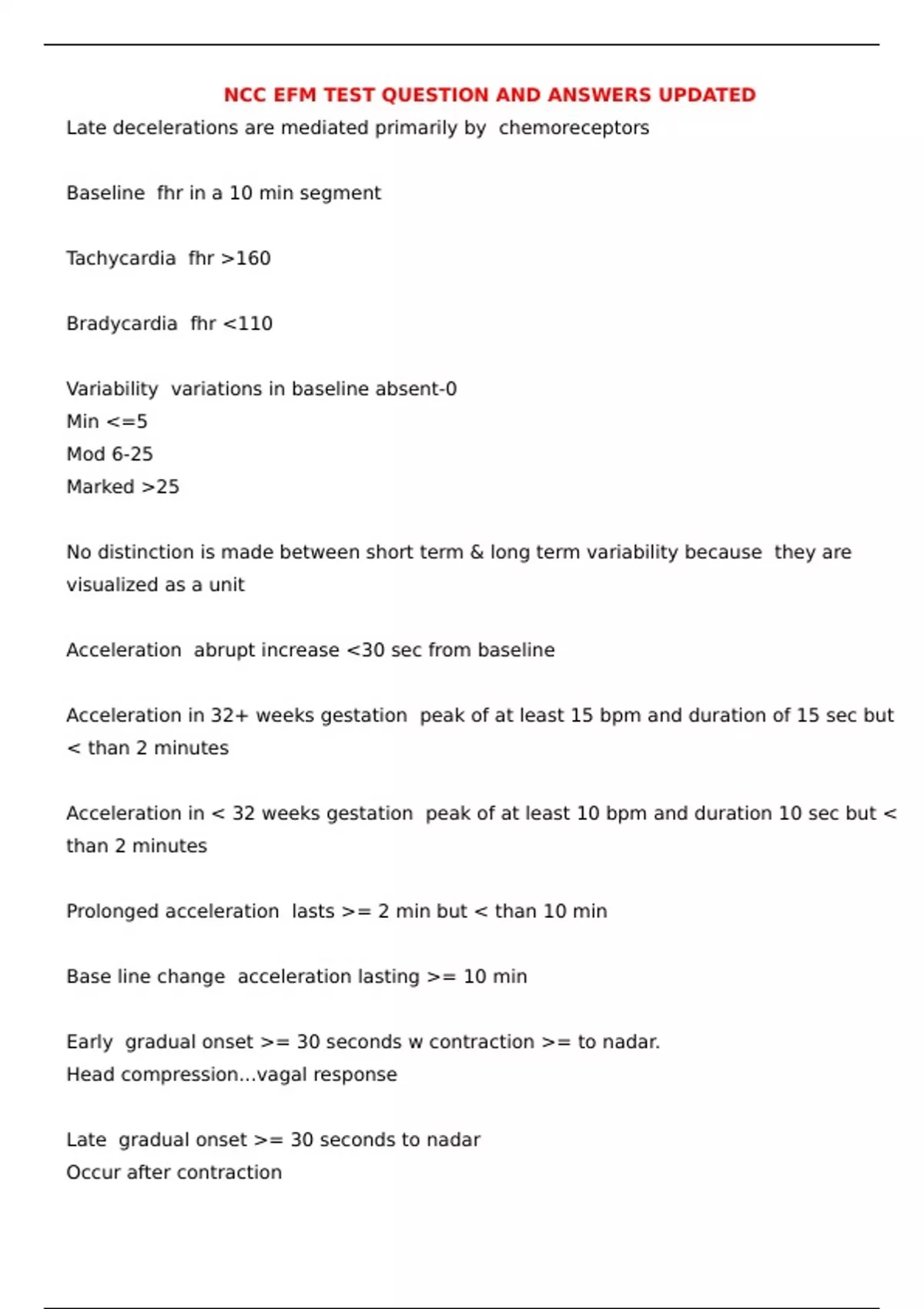 NCC EFM TEST QUESTION AND ANSWERS UPDATED Late decelerations are mediated primarily by chemoreceptors Baseline fhr in a 10 min segment Tachycardia fhr >160 Bradycardia fhr <110 Variability variations in baseline absent-0 Min <=5 Mod 6-25 Marked >25 No distinction is made between short term & long term variability because they are visualized as a unit Acceleration abrupt increase <30 sec from baseline Acceleration in 32+ weeks gestation peak of at least 15 bpm and duration of 15 sec but < than 2 minutes Acceleration in < 32 weeks gestation peak of at least 10 bpm and duration 10 sec but < than 2 minutes Prolonged acceleration lasts >= 2 min but < than 10 min Base line change acceleration lasting >= 10 min Early gradual onset >= 30 seconds w contraction >= to nadar. Head compression...vagal response Late gradual onset >= 30 seconds to nadar Occur after contraction