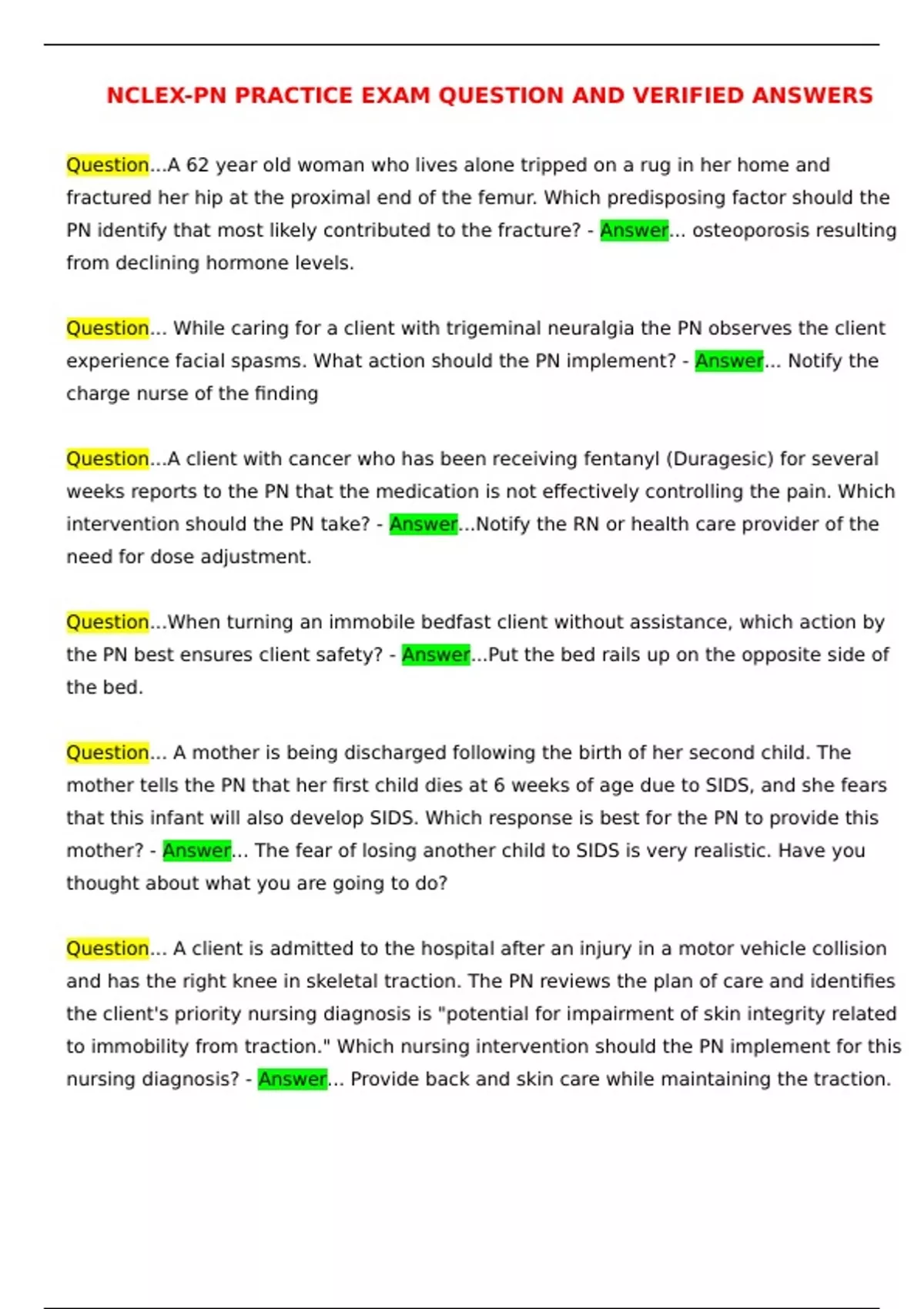 NCLEX-PN PRACTICE EXAM QUESTION AND VERIFIED ANSWERS Question...A 62 year old woman who lives alone tripped on a rug in her home and fractured her hip at the proximal end of the femur. Which predisposing factor should the PN identify that most likely contributed to the fracture? - Answer... osteoporosis resulting from declining hormone levels. Question... While caring for a client with trigeminal neuralgia the PN observes the client experience facial spasms. What action should the PN implement? - Answer... Notify the charge nurse of the finding Question...A client with cancer who has been receiving fentanyl (Duragesic) for several weeks reports to the PN that the medication is not effectively controlling the pain. Which intervention should the PN take? - Answer...Notify the RN or health care provider of the need for dose adjustment. Question...When turning an immobile bedfast client without assistance, which action by the PN best ensures client safety? - Answer...Put the bed rails up on the opposite side of the bed. Question... A mother is being discharged following the birth of her second child. The mother tells the PN that her first child dies at 6 weeks of age due to SIDS, and she fears that this infant will also develop SIDS. Which response is best for the PN to provide this mother? - Answer... The fear of losing another child to SIDS is very realistic. Have you thought about what you are going to do? Question... A client is admitted to the hospital after an injury in a motor vehicle collision and has the right knee in skeletal traction. The PN reviews the plan of care and identifies the client's priority nursing diagnosis is "potential for impairment of skin integrity related to immobility from traction." Which nursing intervention should the PN implement for this nursing diagnosis? - Answer... Provide back and skin care while maintaining the traction. Question... The PN is reinforcing discharge instructions for a 22-year old male client diagnosed with Beurger disease (thromboangitis obliterans). Which referral is most important for this client? - Answer... Smoking cessation program Question... Urinary catheterization is prescribed for a postoperative female client who has been unable to void for 8 hours. The PN inserts the catheter, but no urine is seen in the tubing. What action should the PN take next? - Answer... Leave the catheter in place and reattempt with another catheter. Question... During the admission process, the PN determines that a male client who is scheduled for surgery in the morning has a blood pressure of 160/85. He is drinking coffee and says his blood pressure has never been that high. The PN plans to retake the blood pressure in 30 minutes. This action indicates that the PN recognizes that the elevated blood pressure is likely due to which factor? - Answer... Preoperative anxiety Question... The PN is caring for a client with symptoms of paranoia and psychosis. Which intervention is most important for the PN to implement for the nursing diagnosis, "Impaired social interactions related to inability to trust?" - Answer... Greet the client by first name during each social interaction. Question... An adolescent female client with a diagnosis of anorexia nervosa wants to help serve dinner trays to other clients on a psychiatric unit. What action should the PN take? - Answer... Suggest another way for this client to participate in the unit's activities. Question... A client in a long-term care facility reports to the PN that he has not had a bowel movement in 2 days. Which intervention should the PN implement first? - Answer... Access the client's medical records to determine the client's normal bowel pattern. Question... What types of medications should the PN expect to administer to a client during an acute respiratory distress episode? - Answer... Bronchodilators and steroids