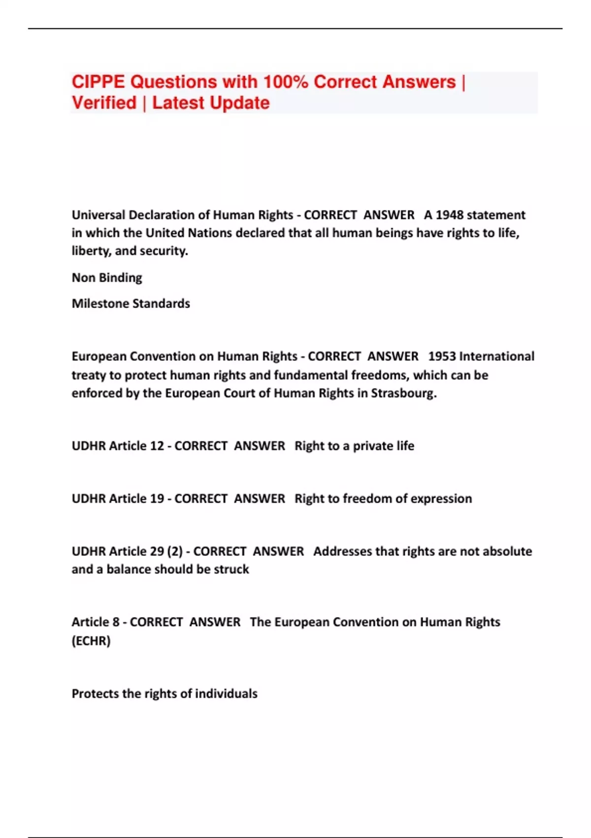 CIPPE Questions with 100% Correct Answers | Verified | Latest Update Universal Declaration of Human Rights - CORRECT ANSWER A 1948 statement in which the United Nations declared that all human beings have rights to life, liberty, and security. Non Binding Milestone Standards European Convention on Human Rights - CORRECT ANSWER 1953 International treaty to protect human rights and fundamental freedoms, which can be enforced by the European Court of Human Rights in Strasbourg. UDHR Article 12