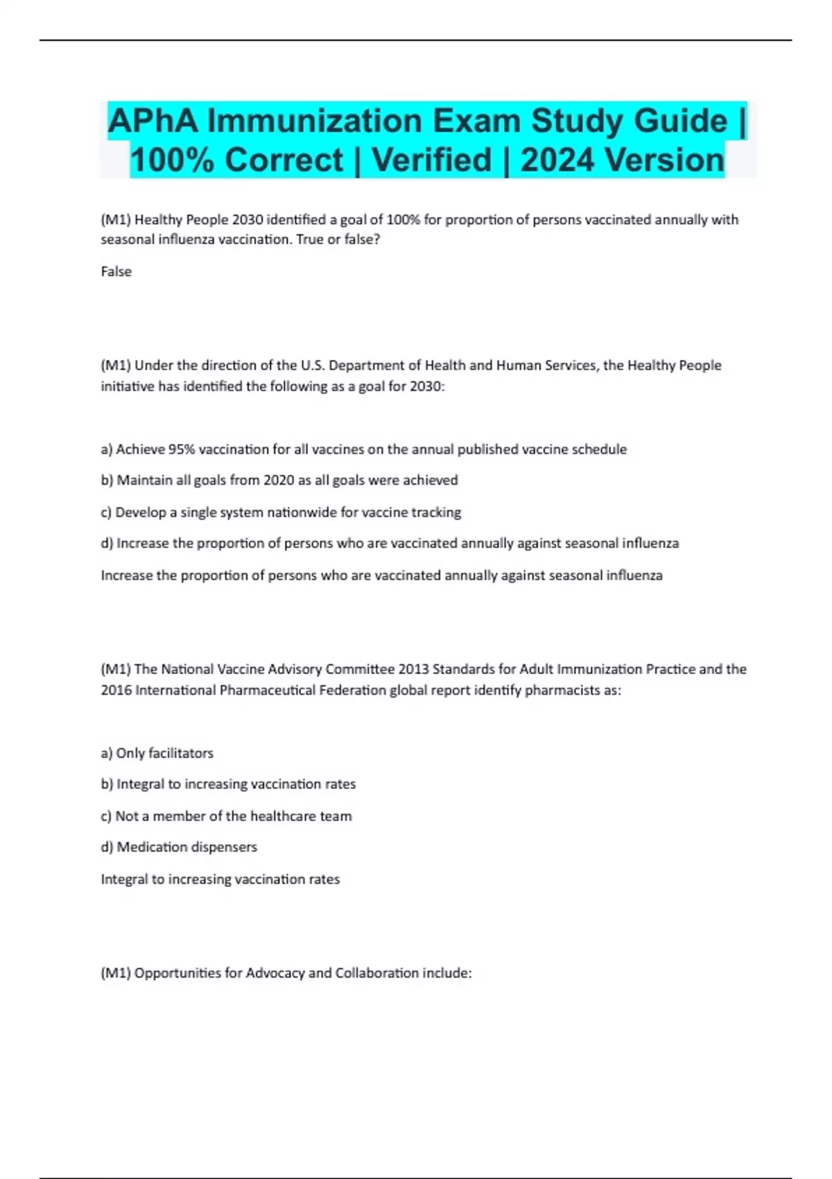 APhA Immunization Exam Study Guide | 100% Correct | Verified | 2024 Version (M1) Healthy People 2030 identified a goal of 100% for proportion of persons vaccinated annually with seasonal influenza vaccination. True or false? False (M1) Under the direction of the U.S. Department of Health and Human Services, the Healthy People initiative has identified the following as a goal for 2030: a) Achieve 95% vaccination for all vaccines on the annual published vaccine schedule b) Maintain all goals from 2020 as all goals were achieved c) Develop a single system nationwide for vaccine tracking d) Increase the proportion of persons who are vaccinated annually against seasonal influenza Increase the proportion of persons who are vaccinated annually against seasonal influenza (M1) The National Vaccine Advisory Committee 2013 Standards for Adult Immunization Practice and the 2016 International Pharmaceutical Federation global report identify pharmacists as: a) Only facilitators b) Integral to increasing vaccination rates c) Not a member of the healthcare team d) Medication dispensers Integral to increasing vaccination rates (M1) Opportunities for Advocacy and Collaboration include: a) There is no need for advocacy since the vaccine schedules dictate what people need to receive b) Discussion with other health care professionals on ways to set prices for vaccines to increase revenue c) Membership in state Immunization coalition to serve as an expert on policy and practice issues affecting pharmacy d) Replace services offered by the local health department so they don't have to offer immunizations Membership in state immunization coalition to serve as an expert on policy and practice issues affecting pharmacy (M1) Which of the following is one of the five guidelines identified by the APhA Board of Trustees in 2019 to assist pharmacists in incorporating immunization activities into their practice? a) Power b) Quantity c) Solidarity d) Prevention Prevention (M1) Which of the following diseases have been eradicated worldwide, allowing vaccination to be discontinued? a) Polio b) Smallpox c) Mumps d) Tetanus Smallpox (M1) What is the definition of collaboration, coordination, and communication among all those involved in meeting the immunization goals of patients and communities? a) Immunization Party b) Healthcare Team c) Prevention Task Force d) Immunization Neighborhood Immunization Neighborhood (M1) In 2019, which of the following vaccine-preventable diseases had fewer than 100 cases in the United States? a) Diphtheria b) Measles c) Pertussis d) Polio Diphtheria, polio (M2) How long does it take for the immune system to provide protection by producing disease-specific antibodies and memory cells? a. 21 days b. 7 days c. 14 days d. 5 days 14 days (M2) Which of the following is found in vaccines to evoke