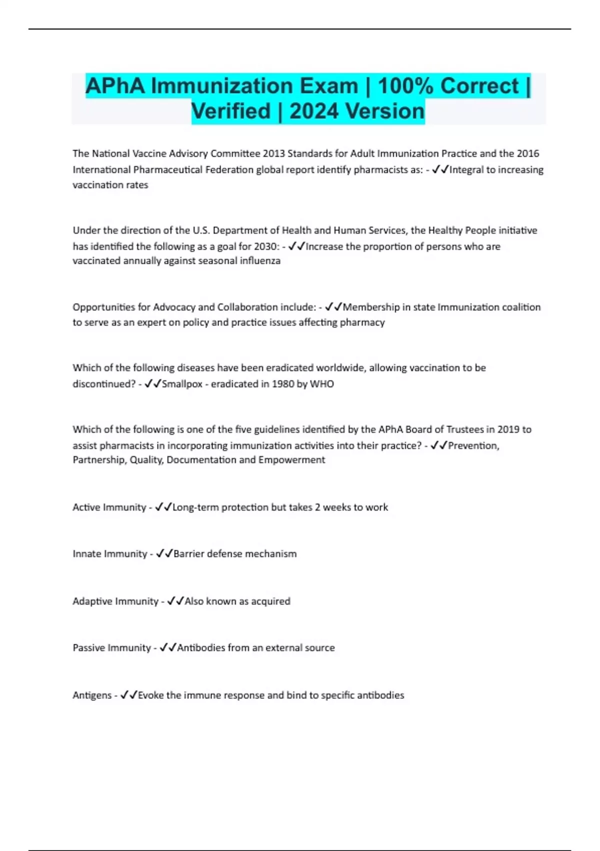 APhA Immunization Exam | 100% Correct | Verified | 2024 Version The National Vaccine Advisory Committee 2013 Standards for Adult Immunization Practice and the 2016 International Pharmaceutical Federation global report identify pharmacists as: - Integral to increasing vaccination rates Under the direction of the U.S. Department of Health and Human Services, the Healthy People initiative has identified the following as a goal for 2030: - Increase the proportion of persons who are vaccinated annually against seasonal influenza Opportunities for Advocacy and Collaboration include: - Membership in state Immunization coalition to serve as an expert on policy and practice issues affecting pharmacy Which of the following diseases have been eradicated worldwide, allowing vaccination to be discontinued? - Smallpox - eradicated in 1980 by WHO Which of the following is one of the five guidelines identified by the APhA Board of Trustees in 2019 to assist pharmacists in incorporating immunization activities into their practice? - Prevention, Partnership, Quality, Documentation and Empowerment Active Immunity - Long-term protection but takes 2 weeks to work Innate Immunity - Barrier defense mechanism Adaptive Immunity - Also known as acquired Passive Immunity - Antibodies from an external source Antigens - Evoke the immune response and bind to specific antibodies T/F: Vaccines contain antibodies which are recognized by the immune system. - False What can a pharmacist do to reduce the risk of getting hepatitis B after exposure? - 1. Post-exposure prophylaxis is needed right away 2. Give both Hep B immune globulin (HBIG) and Hepatitis B vaccine 3. HBIG contains antibodies that provide immediate protection via passive immunity 4. When a person is fully vaccinated, the hepatitis B vaccine provides long-term protection. Live Vaccines are: - 1. Attenuated 2. Stimulates both humoral and cell-mediated immune response 3. May be interfered with by circulating antibodies 4. Not given to children less than 12 months of age due to presence of maternal antibodies Inactivated Vaccines are: - 1. Killed virus or bacteria 2. Does not replicate 3. Stimulates humoral immunity (antibodies) 4. May be given to people who have received blood products or live vaccines, regardless of timing. 5. Predominantly given to infants (less than 12 months) because they may have circulating maternal antibodies which could reduce the effectiveness of a live vaccines. T/F: Inactivated vaccines do NOT have minimum intervals between administered vaccines - True T/F: Inactivated vaccines are not affected by live vaccines and visa versa. - True If two live vaccines are given simultaneously sly on the same day, then you must wait _____ minimum interval. - 28-day minimum interval so that each vaccine can replicate properly. Live vaccines followed by blood products (contain antibodies) require ______minimum interval. - 2 weeks. Which of the following is an example of passive immunity? a.) Contracting measles b.) Hep B Vaccine c.) Skin Barrier d.) Maternal antibodies - d.) Maternal antibodies Why is spacing and timing of vaccines important? - Circulating antibodies may interfere with immune response How long does it take for the immune system to provide protection by producing disease-specific antibodies and memory cells? - 14 days When does Active Immunity occur? - When a patient is exposed to an antigen that triggers the body's immune system to produce it's own disease-specific antibodies and memory cells. Children less than what age do not mount an adequate immune response to t-cell independent immunity? - 2 years. Which of the following is found in vaccines to evoke an immune response? - Antigens What does attenuated mean? - weakened
