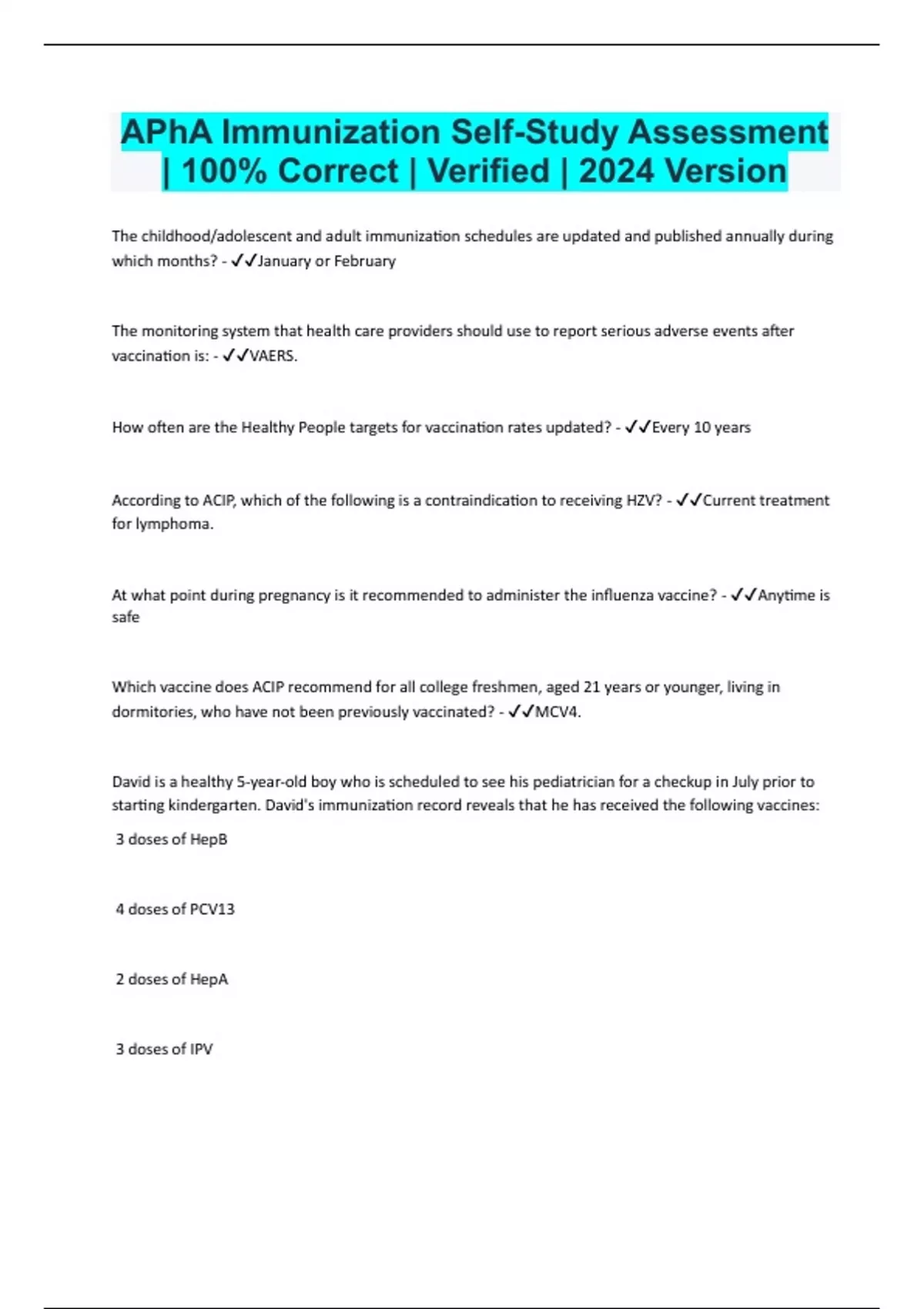 APhA Immunization Self-Study Assessment | 100% Correct | Verified | 2024 Version The childhood/adolescent and adult immunization schedules are updated and published annually during which months? - January or February The monitoring system that health care providers should use to report serious adverse events after vaccination is: - VAERS. How often are the Healthy People targets for vaccination rates updated? - Every 10 years According to ACIP, which of the following is a contraindication to receiving HZV? - Current treatment for lymphoma. At what point during pregnancy is it recommended to administer the influenza vaccine? - Anytime is safe Which vaccine does ACIP recommend for all college freshmen, aged 21 years or younger, living in dormitories, who have not been previously vaccinated? - MCV4. David is a healthy 5-year-old boy who is scheduled to see his pediatrician for a checkup in July prior to starting kindergarten. David's immunization record reveals that he has received the following vaccines: 3 doses of HepB 4 doses of PCV13 2 doses of HepA 3 doses of IPV 2 doses of rotavirus 1 dose of MMRV 4 doses of DTaP 4 doses of Hib Which vaccines should David receive at this visit? - DTaP, IPV, MMR, and varicella. Which of the following statements is true regarding varicella-containing vaccines? - The potency of HZV is greater than that of varicella vaccine. Which disease is almost certain to cause death if infected patients do not receive postexposure prophylaxis? - Rabies. Which of the following documents must be given to every patient or patient's caregiver before administration of a vaccine covered under the National Childhood Vaccine Injury Act (NCVIA)? - VIS. HealthMap Vaccine Finder is a free online tool that allows pharmacists to: - List their vaccination services so patients can find them when searching the website for nearby immunizers. According to ACIP recommendations, HZV is indicated for the prevention of herpes zoster in adults aged: - 60 years and older. Alan is a 47-year-old man who has no documentation of a primary series of tetanus-containing vaccine. Which of the following would be an appropriate primary series for Alan? - Tdap today; Td in 4 weeks; Td 6 months after the second dose. Vaccines as well as exposure to natural disease are both examples of which type of immunity? - Active immunity Which of the following patients is a candidate for both MenACWY and MenB vaccines? - A 10 year- old who just had his spleen removed. Kate is a 24-year-old woman with asthma. She requests a refill of her albuterol inhaler on November 1st. Kate's immunization record indicates that she completed the primary series of MMR, varicella, DTaP, HepA, and HepB vaccines, and she received a dose of Tdap 2 years ago. For complete coverage, which of the following vaccines should she receive? - PPSV23, IIV, and HPV. A history of anaphylaxis caused by neomycin would be a contraindication to receiving which of the following vaccines? - IPV. What is the time interval for which the development of Guillain-Barré syndrome following influenza vaccination would result in a precaution for future influenza vaccines? - Within 6 weeks HZV should not be administered to a patient with a history of anaphylaxis to: - Gelatin. Name the vaccine-preventable disease that may be contracted by unimmunized children from adults serving as reservoirs for the disease, which