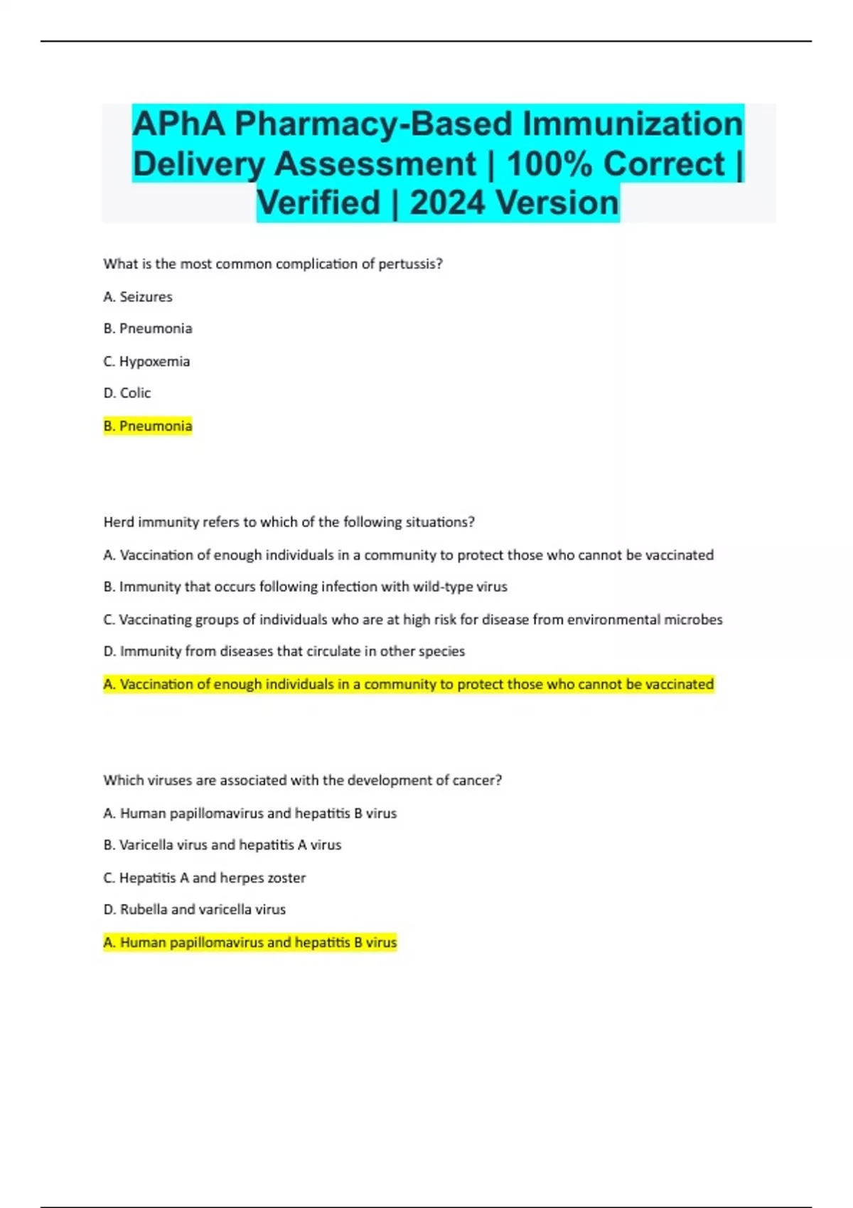 APhA Pharmacy-Based Immunization Delivery Assessment | 100% Correct | Verified | 2024 Version What is the most common complication of pertussis? A. Seizures B. Pneumonia C. Hypoxemia D. Colic B. Pneumonia Herd immunity refers to which of the following situations? A. Vaccination of enough individuals in a community to protect those who cannot be vaccinated B. Immunity that occurs following infection with wild-type virus C. Vaccinating groups of individuals who are at high risk for disease from environmental microbes D. Immunity from diseases that circulate in other species A. Vaccination of enough individuals in a community to protect those who cannot be vaccinated Which viruses are associated with the development of cancer? A. Human papillomavirus and hepatitis B virus B. Varicella virus and hepatitis A virus C. Hepatitis A and herpes zoster D. Rubella and varicella virus A. Human papillomavirus and hepatitis B virus Which of the following patients would be a candidate for PPSV23? A. 12-month-old boy with asthma B. 25-year-old man who smokes cigarettes C. 33-year-old woman who is pregnant D. 50-year-old woman with no medical conditions B. 25-year-old man who smokes cigarettes Which of the following is recognized by sociologists as a factor in a patient's decision whether to be vaccinated? A. History of medication use B. History of chronic medical condition C. Influence of health care provider D. Discount coupon in local newspaper C. Influence of health care provider We have an expert-written solution to this problem! How often are Healthy People targets for vaccination rates updated? A. Every year B. Every 5 years C. Every 10 years D. Every 20 years C. Every 10 years Robert is a 48-year-old pharmacist who is preparing to provide immunizations in his pharmacy for the first time next fall. He has no documentation of receiving the hepatitis B vaccine and would like to be vaccinated before administering vaccines in his practice. What is the recommended routine schedule for vaccination against hepatitis B? A. 0 and 2 months B. 0 and 6 months C. 0, 1, and 2 months D. 0, 1, and 6 months D. 0, 1, and 6 months Which of the following key questions is important to ask a patient before administering IIV? A. Are you sick today? B. During the past year, have you received a blood transfusion or immune (gamma) globulin? C. Have you received any vaccinations in the past 4 weeks? D. Do you have any cancer, Leukemia, AIDS, or any other immune problem? A. Are you sick today? What is the type of immunity occurs when a pregnant woman is vaccinated with Tdap to protect the infant from pertussis after birth? A. Active immunity B. Acquired immunity C. Cell-mediated immunity D. Passive immunity D. Passive immunity What is the minimum needle length recommended