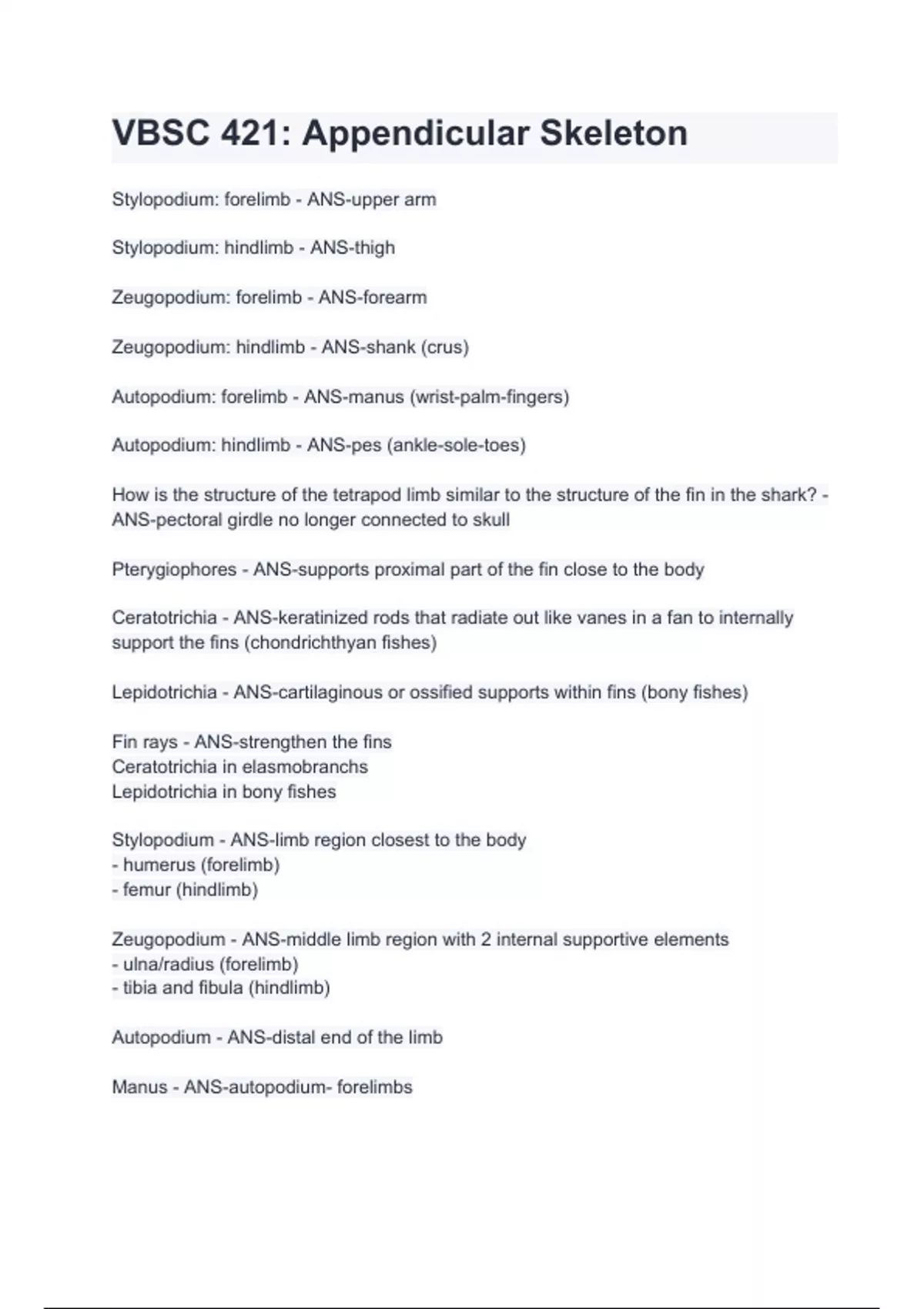VBSC 421_ Appendicular Skeleton with complete solution / Latest updated.
