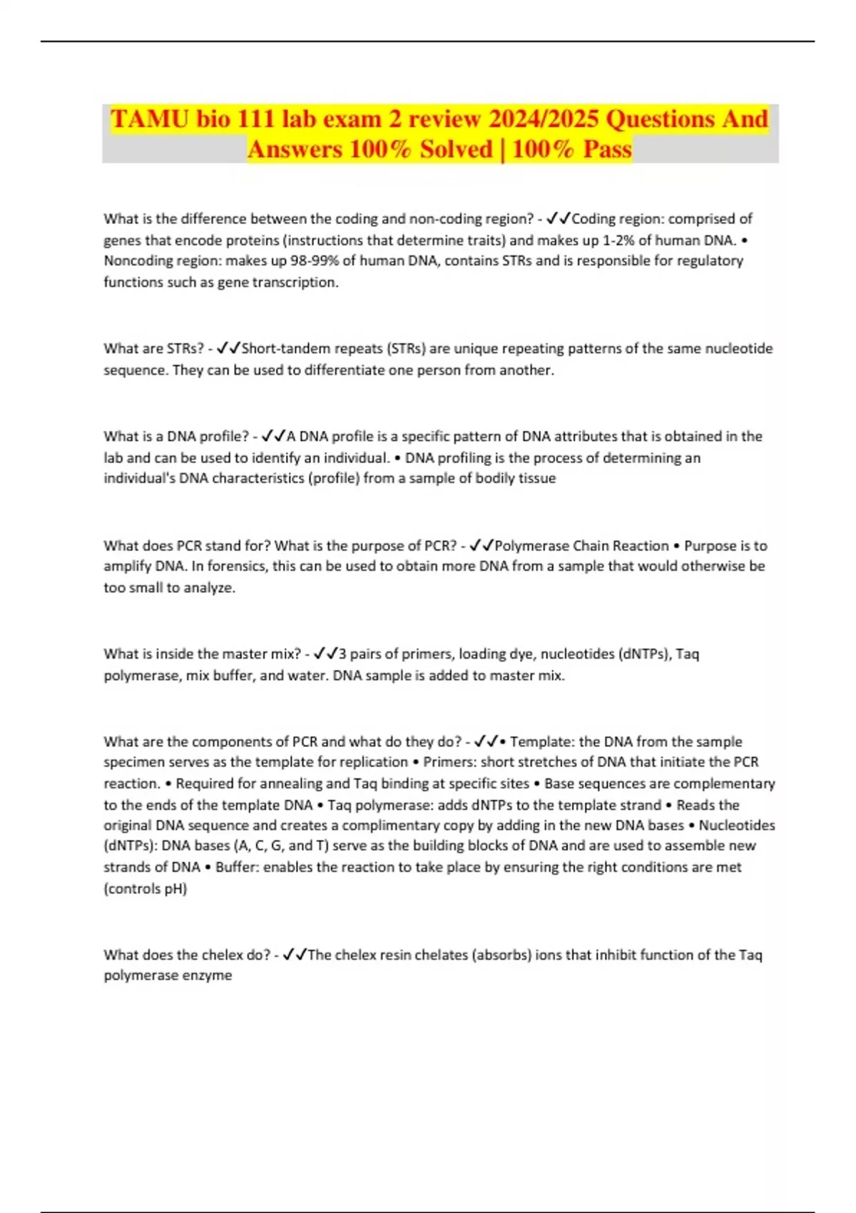 What is the difference between the coding and non-coding region? - Coding region: comprised of genes that encode proteins (instructions that determine traits) and makes up 1-2% of human DNA. • Noncoding region: makes up 98-99% of human DNA, contains STRs and is responsible for regulatory functions such as gene transcription. What are STRs? - Short-tandem repeats (STRs) are unique repeating patterns of the same nucleotide sequence. They can be used to differentiate one person from another. What is a DNA profile? - A DNA profile is a specific pattern of DNA attributes that is obtained in the lab and can be used to identify an individual. • DNA profiling is the process of determining an individual's DNA characteristics (profile) from a sample of bodily tissue What does PCR stand for? What is the purpose of PCR? - Polymerase Chain Reaction • Purpose is to amplify DNA. In forensics, this can be used to obtain more DNA from a sample that would otherwise be too small to analyze. What is inside the master mix? - 3 pairs of primers, loading dye, nucleotides (dNTPs), Taq polymerase, mix buffer, and water. DNA sample is added to master mix. What are the components of PCR and what do they do? - • Template: the DNA from the sample specimen serves as the template for replication • Primers: short stretches of DNA that initiate the PCR reaction. • Required for annealing and Taq binding at specific sites • Base sequences are complementary to the ends of the template DNA • Taq polymerase: adds dNTPs to the template strand • Reads the original DNA sequence and creates a complimentary copy by adding in the new DNA bases • Nucleotides (dNTPs): DNA bases (A, C, G, and T) serve as the building blocks of DNA and are used to assemble new strands of DNA • Buffer: enables the reaction to take place by ensuring the right conditions are met (controls pH)