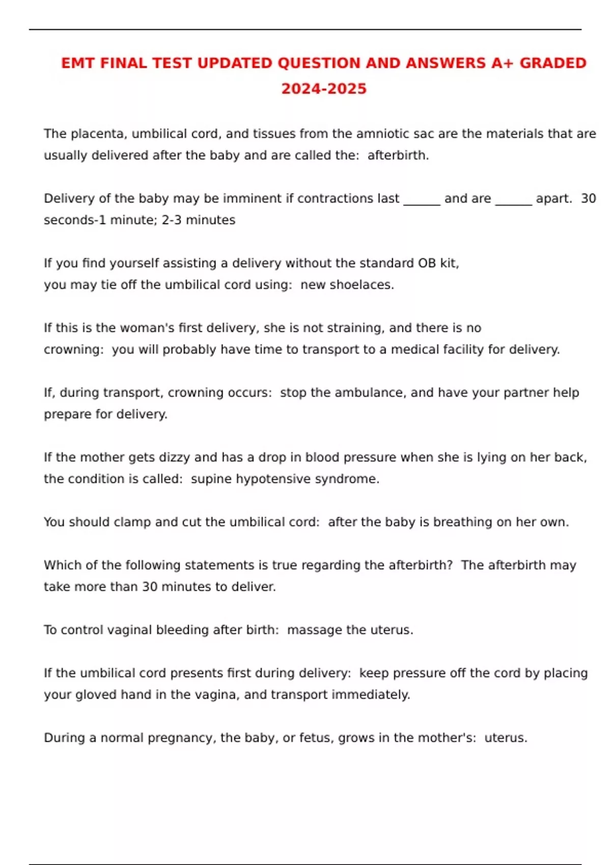 EMT FINAL TEST UPDATED QUESTION AND ANSWERS A+ GRADED The placenta, umbilical cord, and tissues from the amniotic sac are the materials that are usually delivered after the baby and are called the: afterbirth. Delivery of the baby may be imminent if contractions last ______ and are ______ apart. 30 seconds-1 minute; 2-3 minutes If you find yourself assisting a delivery without the standard OB kit, you may tie off the umbilical cord using: new shoelaces. If this is the woman's first delivery, she is not straining, and there is no crowning: you will probably have time to transport to a medical facility for delivery. If, during transport, crowning occurs: stop the ambulance, and have your partner help prepare for delivery. If the mother gets dizzy and has a drop in blood pressure when she is lying on her back, the condition is called: supine hypotensive syndrome. You should clamp and cut the umbilical cord: after the baby is breathing on her own. Which of the following statements is true regarding the afterbirth? The afterbirth may take more than 30 minutes to deliver. To control vaginal bleeding after birth: massage the uterus. If the umbilical cord presents first during delivery: keep pressure off the cord by placing your gloved hand in the vagina, and transport immediately. During a normal pregnancy, the baby, or fetus, grows in the mother's: uterus. Composed of both maternal and fetal tissues, the organ that serves as an exchange area between mother and fetus is the: placenta. The fetus "floats" in a "bag of waters" containing: amniotic fluid. The nine-month period of pregnancy is divided into: trimesters. A delivery in which the baby's buttocks present first at the vaginal opening is called a: breech presentation. The majority of deliveries the EMT will assist with will be: cephalic presentation. The sign of imminent delivery that occurs when the presenting part of the baby first bulges from the vaginal opening is called: crowning. The third stage of labor ends with: the delivery of the afterbirth. The second stage of labor begins with: when the baby enters the birth canal. Meconium staining may be an indication of: fetal distress.