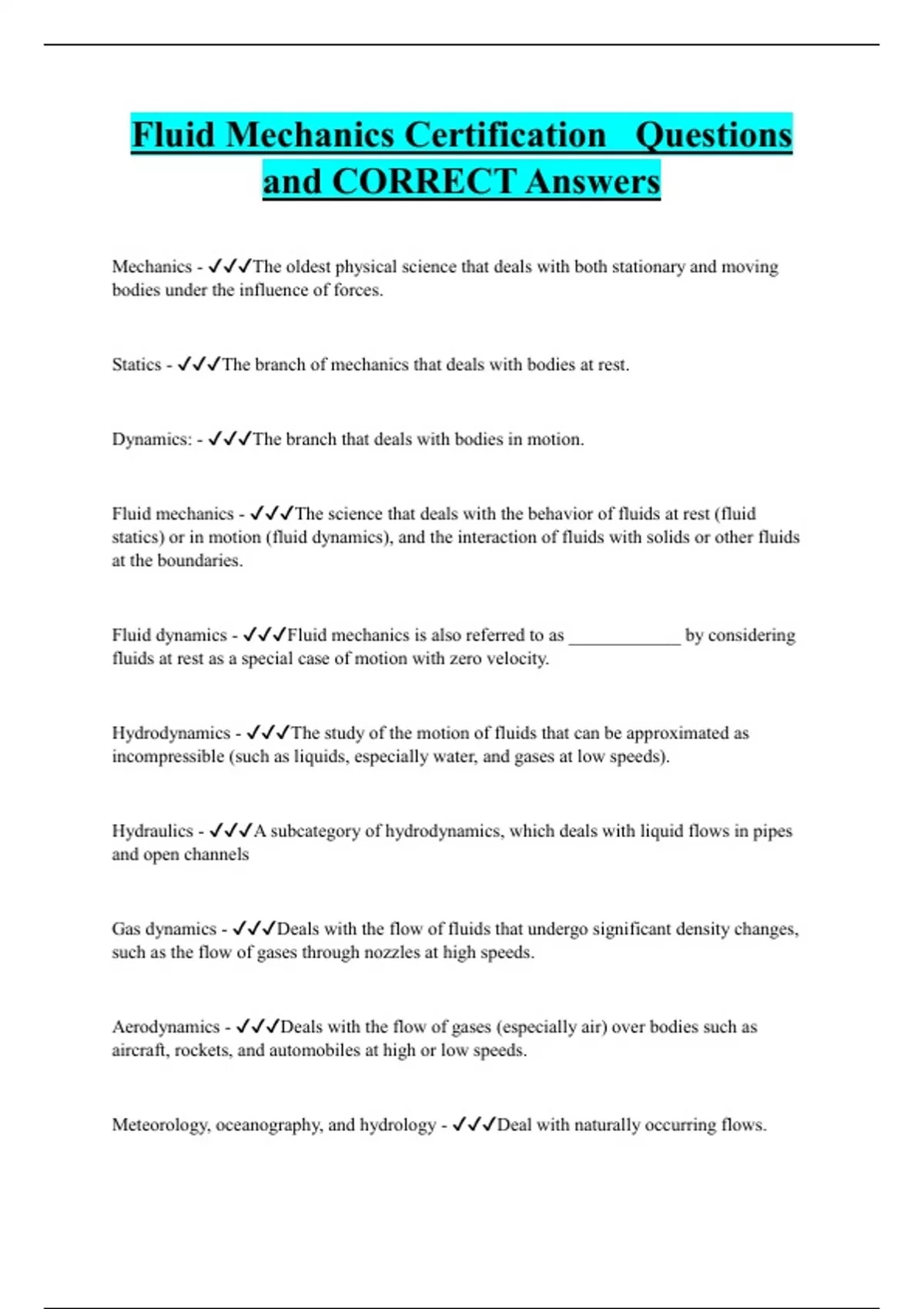 Fluid Mechanics Certification Questions and CORRECT Answers