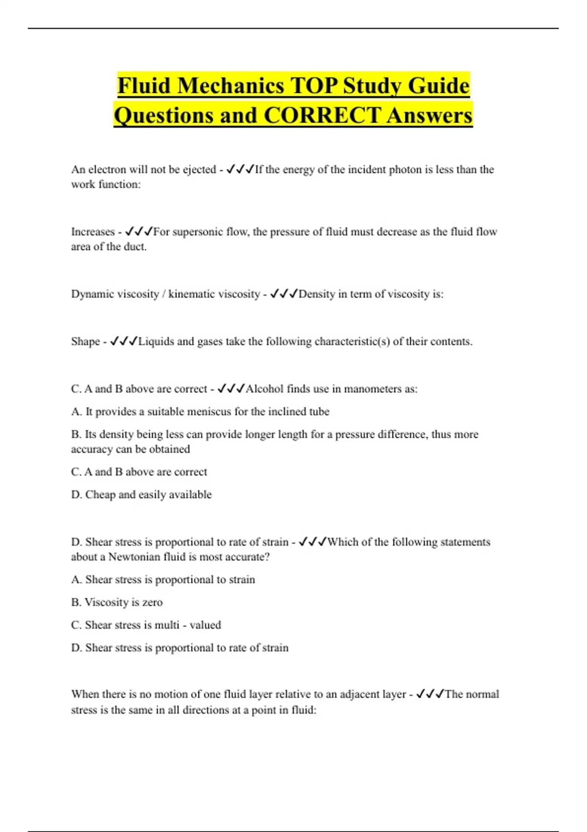 Fluid Mechanics TOP Study Guide Questions and CORRECT Answers