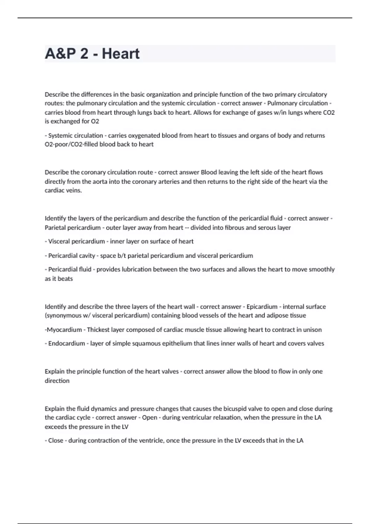 A&P 2 - Heart Question and answers 100% correct A&P 2 - Heart Describe the differences in the basic organization and principle function of the two primary circulatory routes: the pulmonary circulation and the systemic circulation - correct answer - Pulmonary circulation - carries blood from heart through lungs back to heart. Allows for exchange of gases w/in lungs where CO2 is exchanged for O2 - Systemic circulation - carries oxygenated blood from heart to tissues and organs of body and returns O2-poor/CO2-filled blood back to heart Describe the coronary circulation route - correct answer Blood leaving the left side of the heart flows directly from the aorta into the coronary arteries and then returns to the right side of the heart via the cardiac veins. Identify the layers of the pericardium and describe the function of the pericardial fluid - correct answer - Parietal pericardium - outer layer away from heart -- divided into fibrous and serous layer - Visceral pericardium - inner layer on surface of heart - Pericardial cavity - space b/t parietal pericardium and visceral pericardium - Pericardial fluid - provides lubrication between the two surfaces and allows the heart to move smoothly as it beats