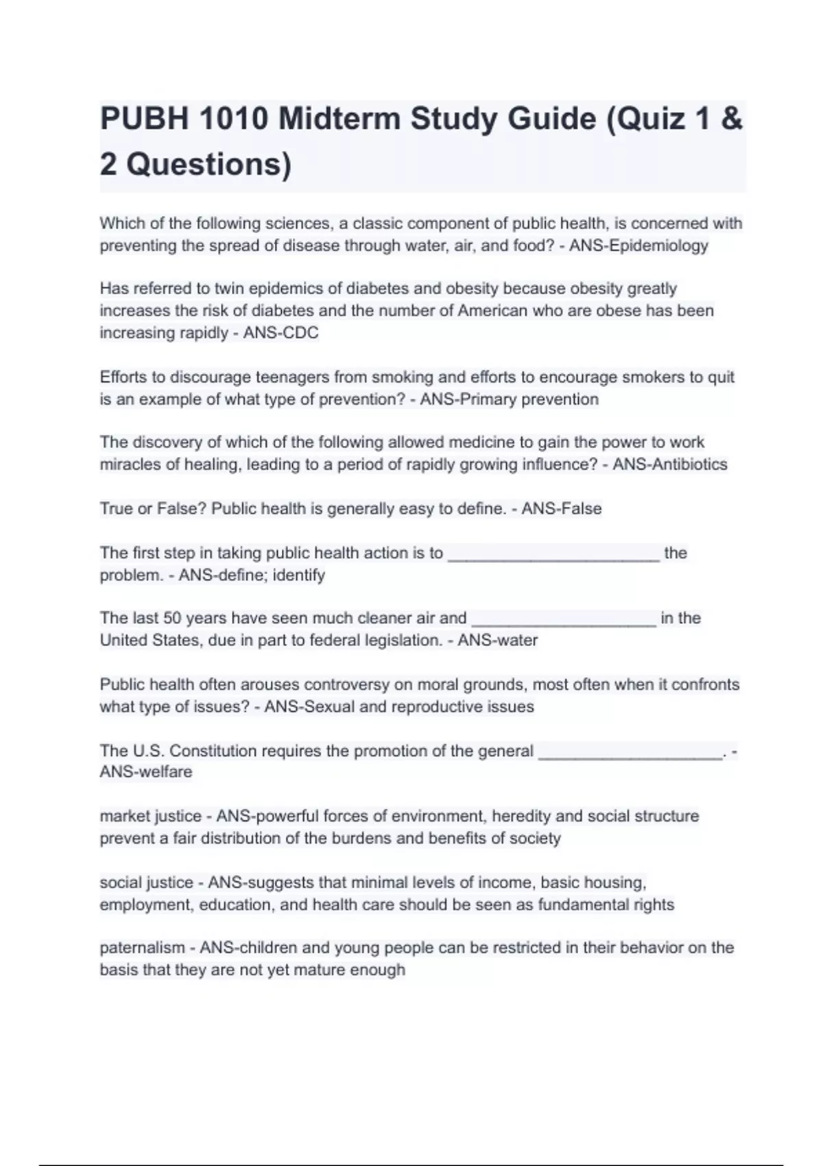 PUBH 1010 Midterm Study Guide (Quiz 1 & 2 Questions)