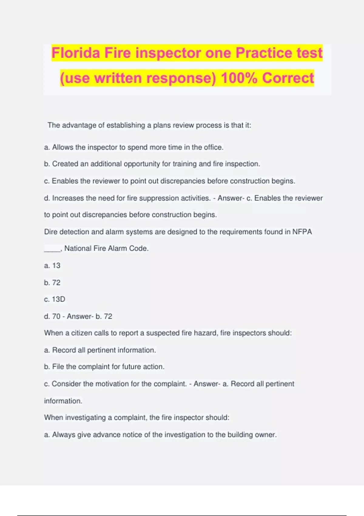 Florida Fire inspector one Practice test (use written response) 100% Correct The advantage of establishing a plans review process is that it: a. Allows the inspector to spend more time in the office. b. Created an additional opportunity for training and fire inspection. c. Enables the reviewer to point out discrepancies before construction begins. d. Increases the need for fire suppression activities. - Answer- c. Enables the reviewer to point out discrepancies before construction begins. Dire detection and alarm systems are designed to the requirements found in NFPA ____, National Fire Alarm Code. a. 13 b. 72 c. 13D d. 70 - Answer- b. 72 When a citizen calls to report a suspected fire hazard, fire inspectors should: a. Record all pertinent information. b. File the complaint for future action. c. Consider the motivation for the complaint. - Answer- a. Record all pertinent information. When investigating a complaint, the fire inspector should: a. Always give advance notice of the investigation to the building owner. b. Advise the building owner of the results of the investigation. c. Recommend that violations such as locked exit doors be corrected within 7 days. d. Provide the name of the person making the complaint to the building owner. - Answer- b. Advise the building owner of the results of the investigation. While investigating a complaint, you find that no violation exists. You should: a. Give the name of the person who made the complaint to the building/business owner. b. Moe on to the next inspection. c. Complete the complaint form, indication that the complaint was unfounded. d. Make up a violation so your time wasn't wasted. - Answer- c. Complete the complaint form, indication that the complaint was unfounded. Prior to a court case, an inspector should do which of the following? a. Not reinspect the facility within the month preceding the trial. b. Go over his/her testimony with the prosecutor before entering the courtroom. c. Appear in your inspection coveralls to convey your professionalism. d. Volunteer information to make responses as detailed and complete as possible. - Answer- b. Go over his/her testimony with the prosecutor before entering the courtroom. Which of the following is suggested for courtroom procedure or behavior? a. Be argumentative while on the witness stand. b. Make sure that all physical evidence, exhibits, photographs, notes, and reference materials are brought to court. c. Attempt to answer every question, even when you do not know the answer. d. Always give your opinion-you are in court as an expert witness. - Answer- b. Make sure that all physical evidence, exhibits, photographs, notes, and reference materials are brought to court. Buildings used as a store, market, and other rooms, buildings or structures used to display and sell merchandise are classified as a(n): a. Mercantile occupancy b. Business occupancy c. Storage occupancy d. Place of assembly - Answer- a. Mercantile occupancy A building, or portion of of a building, used for educat