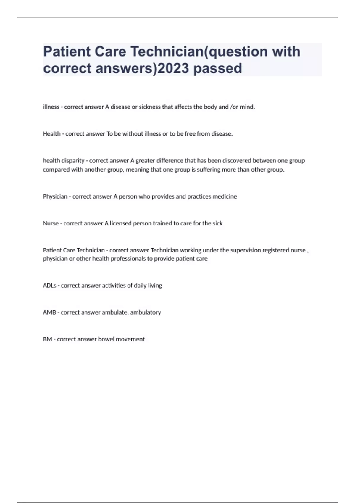 Patient Care Technician(question with correct answers)2023 passed (UPDATED)Patient Care Technician(question with correct answers)2023 passed illness - correct answer A disease or sickness that affects the body and /or mind. Health - correct answer To be without illness or to be free from disease. health disparity - correct answer A greater difference that has been discovered between one group compared with another group, meaning that one group is suffering more than other group. Physician - correct answer A person who provides and practices medicine Nurse - correct answer A licensed person trained to care for the sick Patient Care Technician - correct answer Technician working under the supervision registered nurse , physician or other health professionals to provide patient care ADLs - correct answer activities of daily living AMB - correct answer ambulate, ambulatory BM - correct answer bow