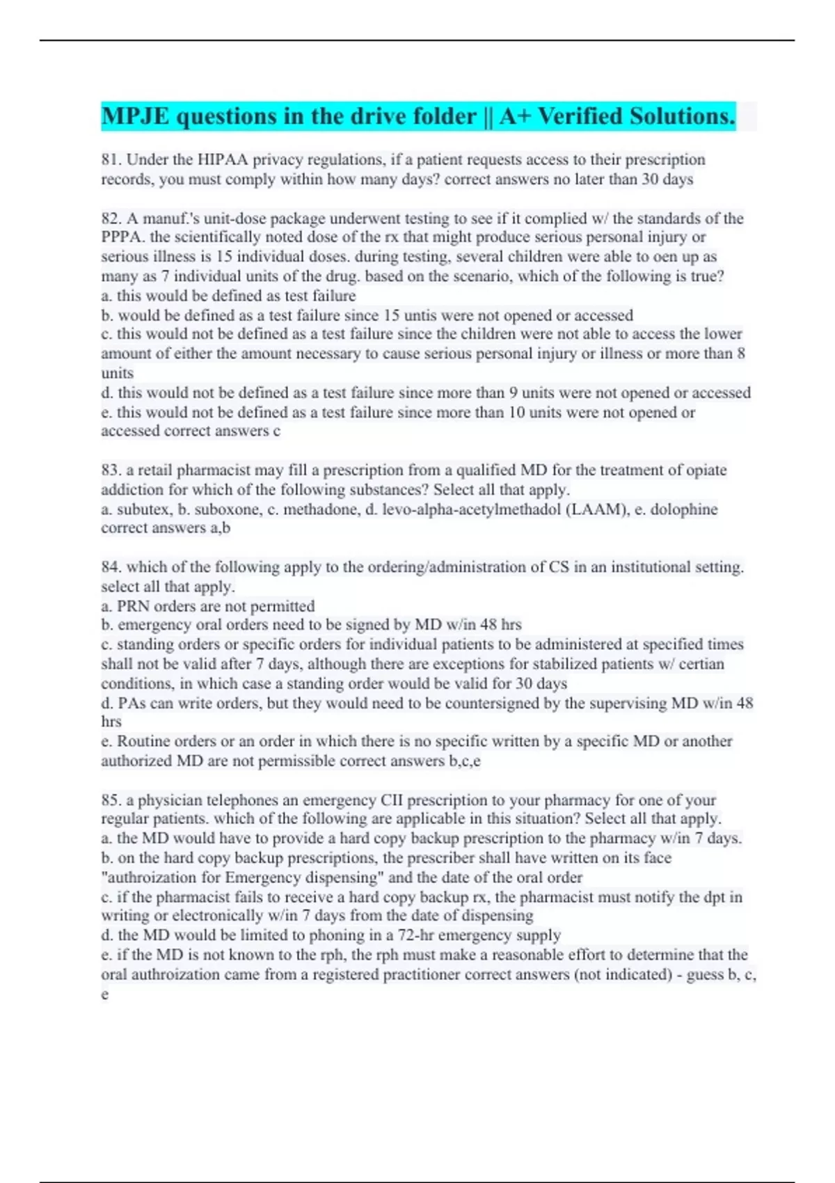 81. Under the HIPAA privacy regulations, if a patient requests access to their prescription records, you must comply within how many days? correct answers no later than 30 days 82. A manuf.'s unit-dose package underwent testing to see if it complied w/ the standards of the PPPA. the scientifically noted dose of the rx that might produce serious personal injury or serious illness is 15 individual doses. during testing, several children were able to oen up as many as 7 individual units of the drug. based on the scenario, which of the following is true? a. this would be defined as test failure b. would be defined as a test failure since 15 untis were not opened or accessed c. this would not be defined as a test failure since the children were not able to access the lower amount of either the amount necessary to cause serious personal injury or illness or more than 8 units d. this would not be defined as a test failure since more than 9 units were not opened or accessed e. this would not be defined as a test failure since more than 10 units were not opened or accessed correct answers c 83. a retail pharmacist may fill a prescription from a qualified MD for the treatment of opiate addiction for which of the following substances? Select all that apply. a. subutex, b. suboxone, c. methadone, d. levo-alpha-acetylmethadol (LAAM), e. dolophine correct answers a,b 84. which of the following apply to the ordering/administration of CS in an institutional setting. select all that apply. a. PRN orders are not permitted b. emergency oral orders need to be signed by MD w/in 48 hrs c. standing orders or specific orders for individual patients to be administered at specified times shall not be valid after 7 days, although there are exceptions for stabilized patients w/ certian conditions, in which case a standing order would be valid for 30 days d. PAs can write orders, but they would need to be countersigned by the supervising MD w/in 48 hrs e. Routine orders or an order in which there is no specific written by a specific MD or another authorized MD are not permissible correct answers b,c,e 85. a physician telephones an emergency CII prescription to your pharmacy for one of your regular patients. which of the following are applicable in this situation? Select all that apply. a. the MD would have to provide a hard copy backup prescription to the pharmacy w/in 7 days. b. on the hard copy backup prescriptions, the prescriber shall have written on its face "authroization for Emergency dispensing" and the date of the oral order c. if the pharmacist fails to receive a hard copy backup rx, the pharmacist must notify the dpt in writing or electronically w/in 7 days from the date of dispensing d. the MD would be limited to phoning in a 72-hr emergency supply e. if the MD is not known to the rph, the rph must make a reasonable effort to determine that the oral authroization came from a registered practitioner correct answers (not indicated) - guess b, c, e