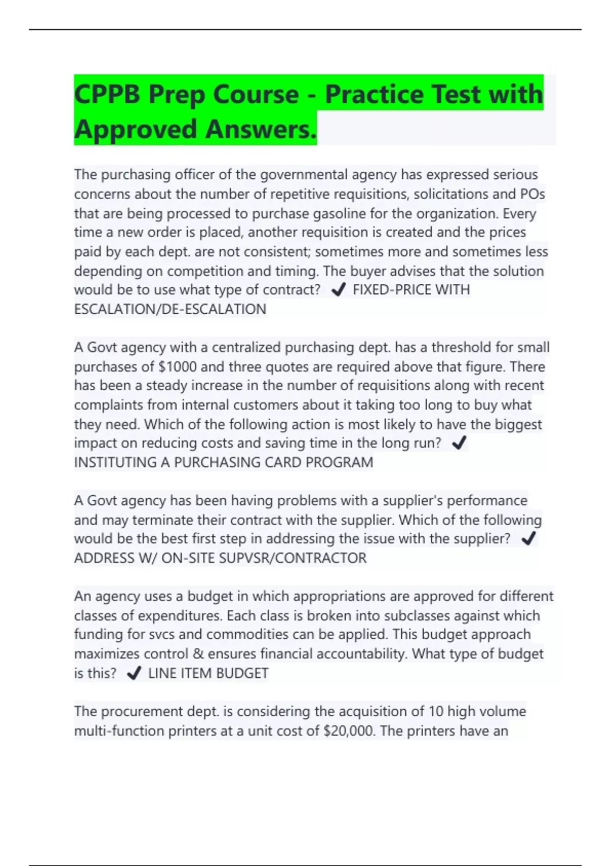 CPPB Prep Course - Practice Test with Approved Answers. The purchasing officer of the governmental agency has expressed serious concerns about the number of repetitive requisitions, solicitations and POs that are being processed to purchase gasoline for the organization. Every time a new order is placed, another requisition is created and the prices paid by each dept. are not consistent; sometimes more and sometimes less depending on competition and timing. The buyer advises that the solution would be to use what type of contract? ️ FIXED-PRICE WITH ESCALATION/DE-ESCALATION A Govt agency with a centralized purchasing dept. has a threshold for small purchases of $1000 and three quotes are required above that figure. There has been a steady increase in the number of requisitions along with recent complaints from internal customers about it taking too long to buy what they need. Which of the following action is most likely to have the biggest impact on reducing costs and saving time in the long run? ️ INSTITUTING A PURCHASING CARD PROGRAM A Govt agency has been having problems with a supplier's performance and may terminate their contract with the supplier. Which of the following would be the best first step in addressing the issue with the supplier? ️ ADDRESS W/ ON-SITE SUPVSR/CONTRACTOR An agency uses a budget in which appropriations are approved for different classes of expenditures. Each class is broken into subclasses against which funding for svcs and commodities can be applied. This budget approach maximizes control & ensures financial accountability. What type of budget is this? ️ LINE ITEM BUDGET The procurement dept. is considering the acquisition of 10 high volume multi-function printers at a unit cost of $20,000. The printers have an