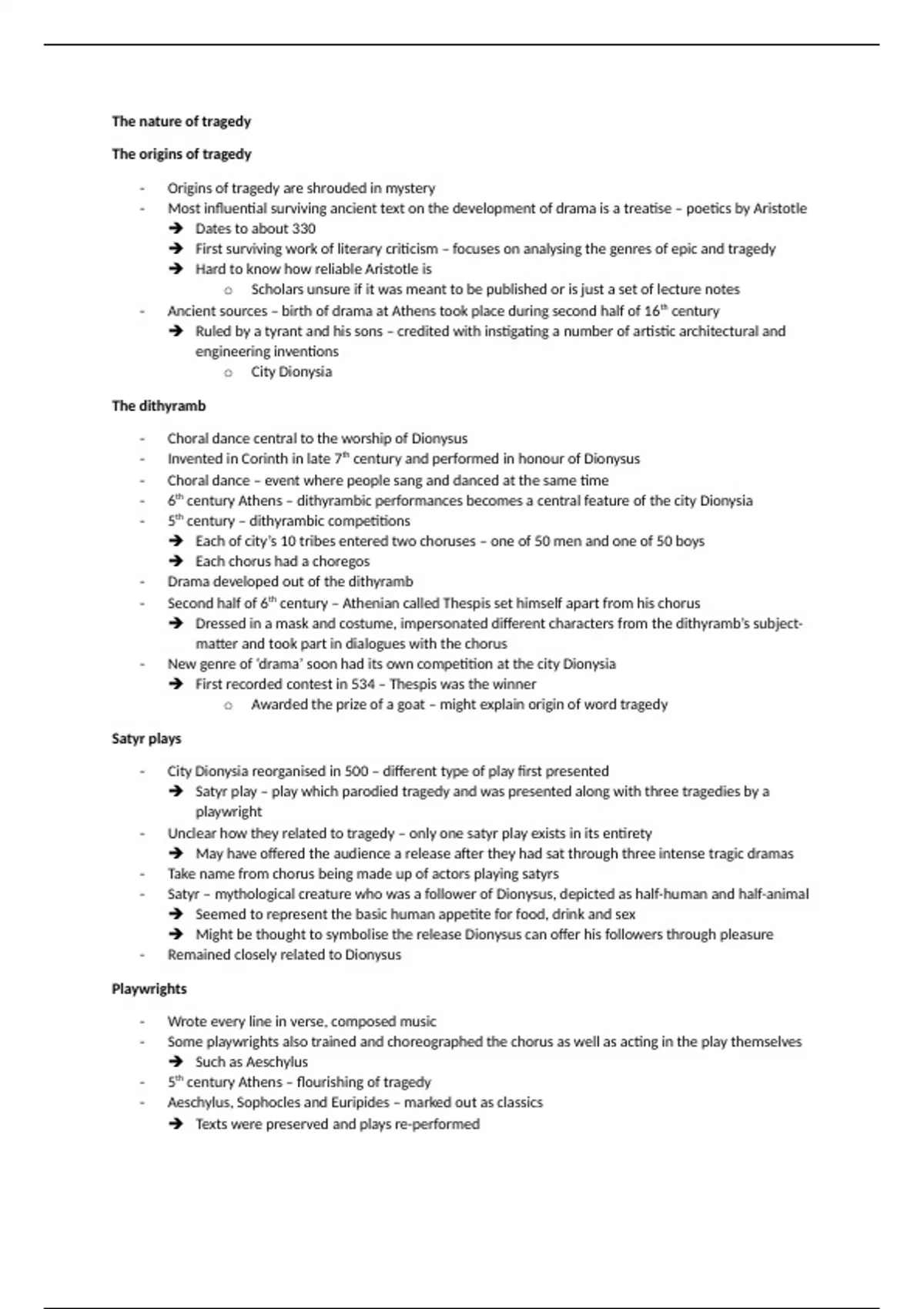 Notes on: - origins of tragedy and how it developed during the 5th century BC - including its relationship to satyr plays, the contribution of Aeschylus, Sophocles and Euripides, use of actors and the chorus, use of masks, costumes and props, common themes of tragedy, relationship between the cultural context and social matter of the plays, Aristotle’s theories about tragedies - including peripiteia (reversal of fortune), hamartia (tragic mistake) and catharsis (purging of emotions)