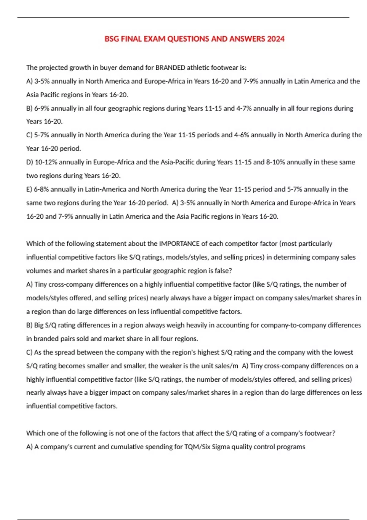 BSG FINAL EXAM QUESTIONS AND ANSWERS 2024 The projected growth in buyer demand for BRANDED athletic footwear is: A) 3-5% annually in North America and Europe-Africa in Years 16-20 and 7-9% annually in Latin America and the Asia Pacific regions in Years 16-20. B) 6-9% annually in all four geographic regions during Years 11-15 and 4-7% annually in all four regions during Years 16-20. C) 5-7% annually in North America during the Year 11-15 periods and 4-6% annually in North America during the Year 16-20 period. D) 10-12% annually in Europe-Africa and the Asia-Pacific during Years 11-15 and 8-10% annually in these same two regions during Years 16-20. E) 6-8% annually in Latin-America and North America during the Year 11-15 period and 5-7% annually in the same two regions during the Year 16-20 period. A) 3-5% annually in North America and Europe-Africa in Years 16-20 and 7-9% annually in Latin America and the Asia Pacific regions in Years 16-20. Which of the following statement about the IMPORTANCE of each competitor factor (most particularly influential competitive factors like S/Q ratings, models/styles, and selling prices) in determining company sales volumes and market shares in a particular geographic region is false? A) Tiny cross-company differences on a highly influential competitive factor (like S/Q ratings, the number of models/styles offered, and selling prices) nearly always have a bigger impact on company sales/market shares in a region than do large differences on less influential competitive factors. B) Big S/Q rating differences in a region always weigh heavily in accounting for company-to-company differences in branded pairs sold and market share in all four regions. C) As the spread between the company with the region's highest S/Q rating and the company with the lowest S/Q rating becomes smaller and smaller, the weaker is the unit sales/m A) Tiny cross-company differences on a highly influential competitive factor (like S/Q ratings, the number of models/styles offered, and selling prices) nearly always have a bigger impact on company sales/market shares in a region than do large differences on less influential competitive factors.