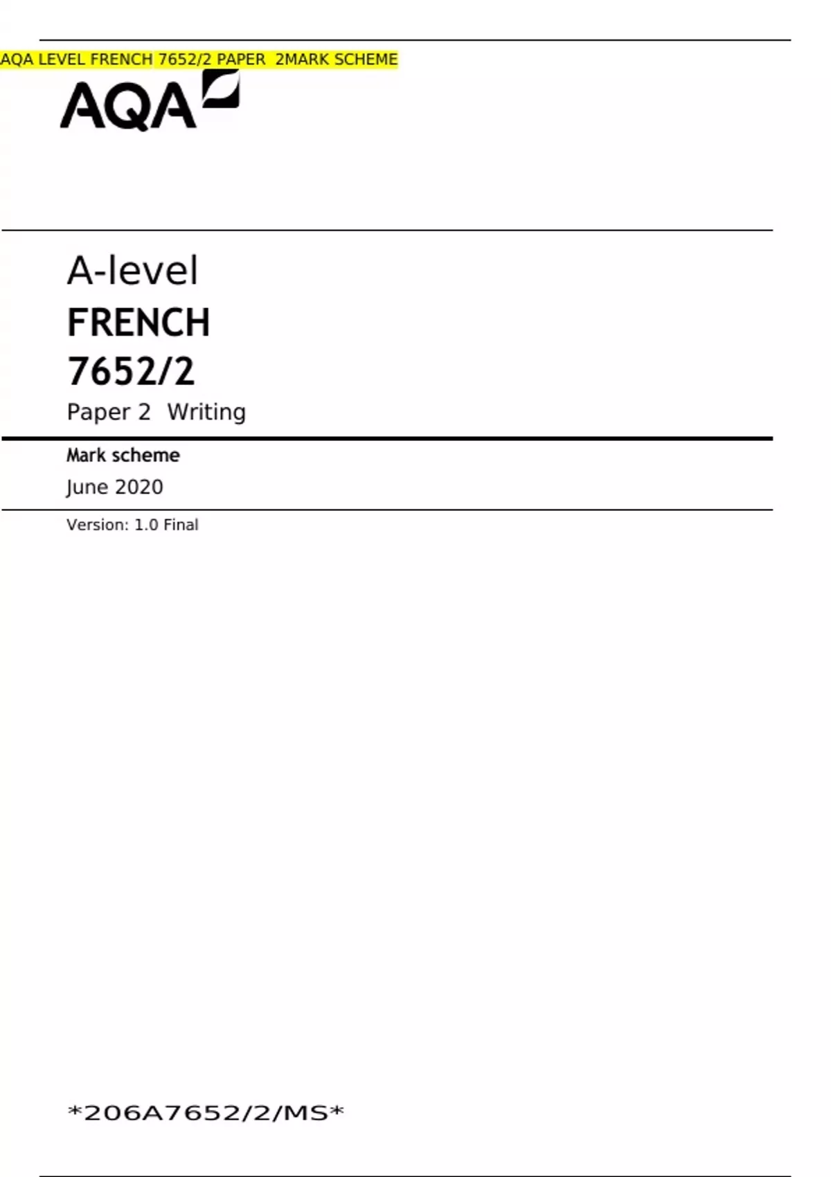 , MARK SCHEME – A-LEVEL FRENCH – 7652/2 –
