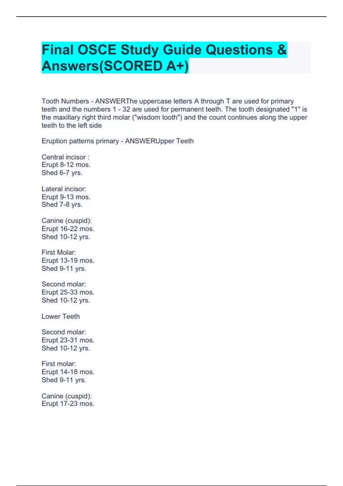 Tooth Numbers - ANSWERThe uppercase letters A through T are used for primary teeth and the numbers 1 - 32 are used for permanent teeth. The tooth designated "1" is the maxillary right third molar ("wisdom tooth") and the count continues along the upper teeth to the left side Eruption patterns primary - ANSWERUpper Teeth Central incisor : Erupt 8-12 mos. Shed 6-7 yrs. Lateral incisor: Erupt 9-13 mos. Shed 7-8 yrs. Canine (cuspid): Erupt 16-22 mos. Shed 10-12 yrs. First Molar: Erupt 13-19 mos. Shed 9-11 yrs. Second molar: Erupt 25-33 mos. Shed 10-12 yrs. Lower Teeth Second molar: Erupt 23-31 mos. Shed 10-12 yrs. First molar: Erupt 14-18 mos. Shed 9-11 yrs. Canine (cuspid): Erupt 17-23 mos. Shed 9-12 yrs. Lateral incisor: Erupt 10-16 mos. Shed 7-8 yrs. Central incisor: Erupt 6-10 mos. Shed 6-7 yrs. eruption patterns permanent - ANSWERUpper Teeth Erupt Central incisor 7-8 yrs. Lateral incisor 8-9 yrs. Canine (cuspid) 11-12 yrs. First premolar (first bicuspid) 10-11 yrs. Second premolar (second bicuspid)10-12 yrs. First molar 6-7 yrs. Second molar 12-13 yrs. Third molar (wisdom tooth) 17-21 yrs. Lower Teeth Erupt Third molar (wisdom tooth) 17-21 yrs. Second molar 11-13 yrs. First molar 6-7 yrs. Second premolar (second bicuspid)11-12 yrs. First premolar (first bicuspid) 10-12 yrs. Canine (cuspid) 9-10 yrs. Lateral incisor 7-8 yrs. Central incisor 6-7 yrs Canine malocclusion classification: Class one - ANSWERANGLE Class I: NEUTROOCCLUSION Molar Relationship: The mesiobuccal cusp of the maxillary first permanent molar occludes with the mesiobuccal groove of the mandibular first permanent molar. Canine Relationship: - The mesial incline of the maxillary canine occludes with the distal incline of the