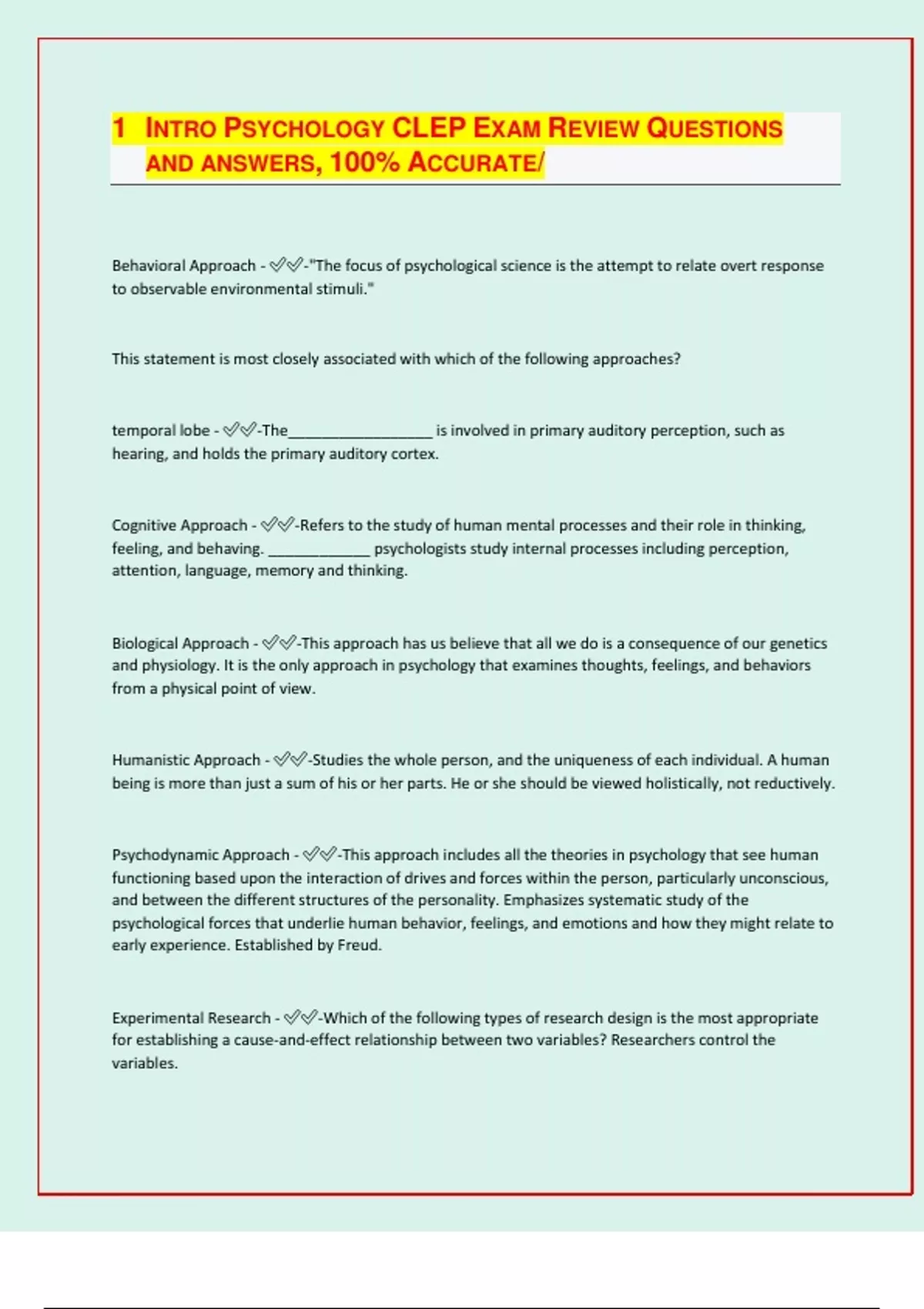 INTRO PSYCHOLOGY CLEP EXAM REVIEW QUESTIONS AND ANSWERS, 100% ACCURATE/ Behavioral Approach - -"The focus of psychological science is the attempt to relate overt response to observable environmental stimuli." This statement is most closely associated with which of the following approaches? temporal lobe - -The_________________ is involved in primary auditory perception, such as hearing, and holds the primary auditory cortex. Cognitive Approach - -Refers to the study of human mental processes and their role in thinking, feeling, and behaving. ____________ psychologists study internal processes including perception, attention, language, memory and thinking. Biological Approach - -This approach has us believe that all we do is a consequence of our genetics and physiology. It is the only approach in psychology that examines thoughts, feelings, and behaviors from a physical point of view. Humanistic Approach - -Studies the whole person, and the uniqueness of each individual. A human being is more than just a sum of his or her parts. He or she should be viewed holistically, not reductively. Psychodynamic Approach - -This approach includes all the theories in psychology that see human functioning based upon the interaction of drives and forces within the person, particularly unconscious, and between the different structures of the personality. Emphasizes systematic study of the psychological forces that underlie human behavior, feelings, and emotions and how they might relate to early experience. Established by Freud. Experimental Research - -Which of the following types of research design is the most appropriate for establishing a cause-and-effect relationship between two variables? Researchers control the variables. Correlational Research - -Determines if a relationship exists between two or more variables, and if so, to what degree the relationship occurs. Types include archival research, survey research, and natural observation. Researchers do not control the variables; data already exists. Naturalistic observation - -Observing and recording behavior in naturally occurring situations without trying to manipulate and control the situation. Case study - -A descriptive study that includes an intensive study of one person, or a small group, and allows an intensive examination of a single case, usually chosen for its interesting or unique characteristics William Wundt - -The science of psychology is typically dated from the establishment of the latenineteenth-century Leipzig laboratory of informed consent - -The requirement that prospective participants know the general nature of a study so that they can decide whether to participate is a major part of an operational definition - -The statement "Response latency is the number of seconds that elapses between the stimulus and the response" is an example of an operational definition - -Indicates what the researchers specifically must do to measure the concept and collect needed information. This mea