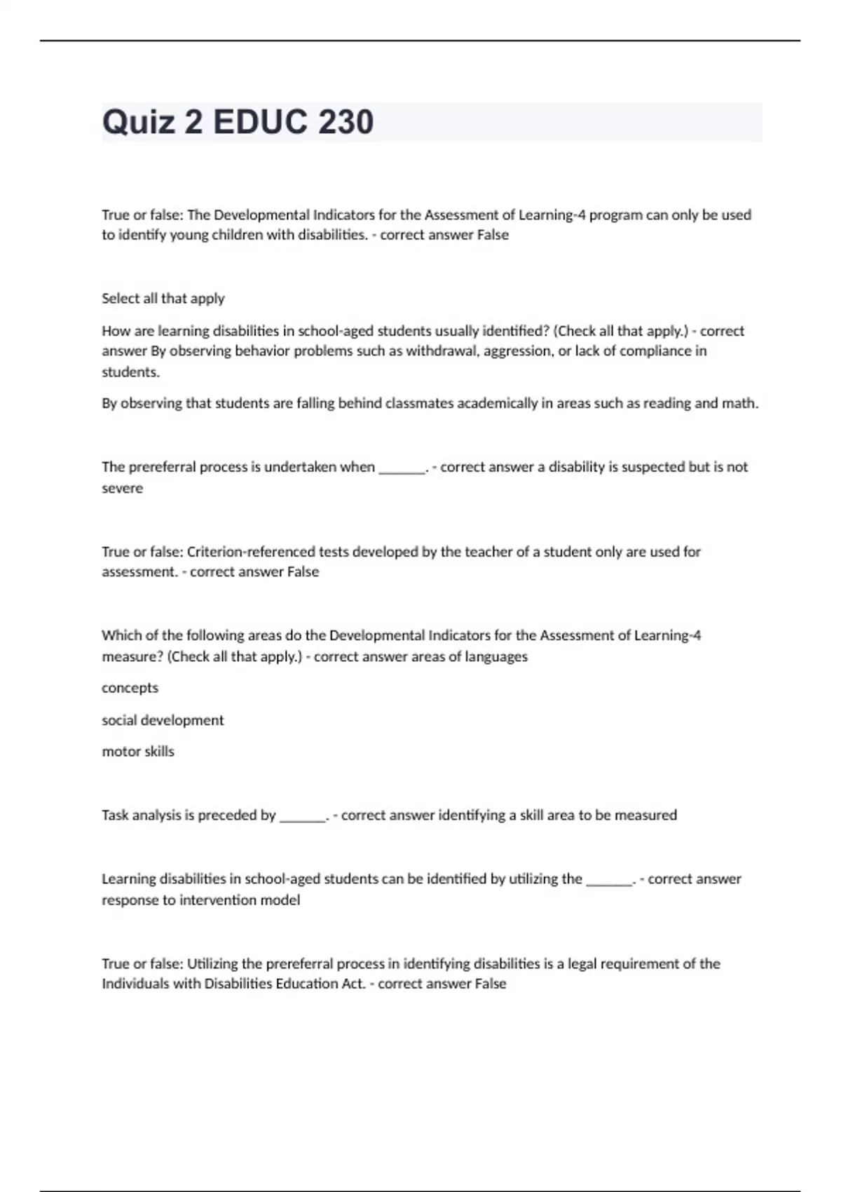Quiz 2 EDUC 230 questions with complete solutions graded A+True or false: The Developmental Indicators for the Assessment of Learning-4 program can only be used to identify young children with disabilities. - correct answer False Select all that apply How are learning disabilities in school-aged students usually identified? (Check all that apply.) - correct answer By observing behavior problems such as withdrawal, aggression, or lack of compliance in students. By observing that students are falling behind classmates academically in areas such as reading and math. The prereferral process is undertaken when ______. - correct answer a disability is suspected but is not severe True or false: Criterion-referenced tests developed by the teacher of a student only are used for assessment. - correct answer False Which of the following areas do the Developmental Indicators for the Assessment of Learning-4 measure? (Check all that apply.) - correct answer areas of languages concepts social development motor skills Task analysis is preceded by ______. - correct answer identifying a skill area to be measured Learning disabilities in school-aged students can be identified by utilizing the ______. - correct answer response to intervention model True or false: Utilizing the prereferral process in identifying disabilities is a legal requirement of the Individuals with Disabilities Education Act. - correct answer False