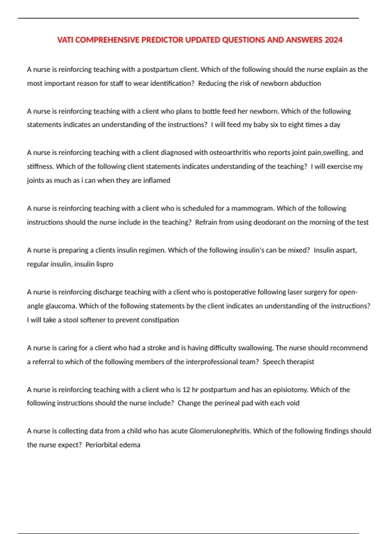 VATI COMPREHENSIVE PREDICTOR UPDATED QUESTIONS AND ANSWERS 2024 A nurse is reinforcing teaching with a postpartum client. Which of the following should the nurse explain as the most important reason for staff to wear identification? Reducing the risk of newborn abduction A nurse is reinforcing teaching with a client who plans to bottle feed her newborn. Which of the following statements indicates an understanding of the instructions? I will feed my baby six to eight times a day A nurse is reinforcing teaching with a client diagnosed with osteoarthritis who reports joint pain,swelling, and stiffness. Which of the following client statements indicates understanding of the teaching? I will exercise my joints as much as i can when they are inflamed A nurse is reinforcing teaching with a client who is scheduled for a mammogram. Which of the following instructions should the nurse include in the teaching? Refrain from using deodorant on the morning of the test A nurse is preparing a clients insulin regimen. Which of the following insulin's can be mixed? Insulin aspart, regular insulin, insulin lispro A nurse is reinforcing discharge teaching with a client who is postoperative following laser surgery for open-angle glaucoma. Which of the following statements by the client indicates an understanding of the instructions? I will take a stool softener to prevent constipation A nurse is caring for a client who had a stroke and is having difficulty swallowing. The nurse should recommend a referral to which of the following members of the interprofessional team? Speech therapist