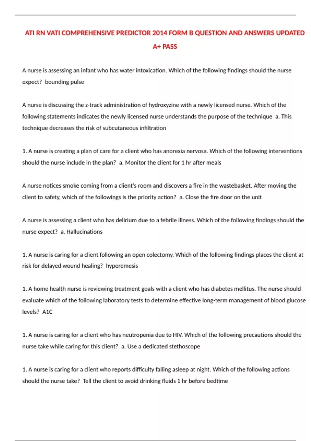 ATI RN VATI COMPREHENSIVE PREDICTOR 2014 FORM B QUESTION AND ANSWERS UPDATED A+ PASS A nurse is assessing an infant who has water intoxication. Which of the following findings should the nurse expect? bounding pulse A nurse is discussing the z-track administration of hydroxyzine with a newly licensed nurse. Which of the following statements indicates the newly licensed nurse understands the purpose of the technique a. This technique decreases the risk of subcutaneous infiltration 1. A nurse is creating a plan of care for a client who has anorexia nervosa. Which of the following interventions should the nurse include in the plan? a. Monitor the client for 1 hr after meals A nurse notices smoke coming from a client's room and discovers a fire in the wastebasket. After moving the client to safety, which of the followings is the priority action? a. Close the fire door on the unit A nurse is assessing a client who has delirium due to a febrile illness. Which of the following findings should the nurse expect? a. Hallucinations 1. A nurse is caring for a client following an open colectomy. Which of the following findings places the client at risk for delayed wound healing? hyperemesis 1. A home health nurse is reviewing treatment goals with a client who has diabetes mellitus. The nurse should evaluate which of the following laboratory tests to determine effective long-term management of blood glucose levels? A1C 1. A nurse is caring for a client who has neutropenia due to HIV. Which of the following precautions should the nurse take while caring for this client? a. Use a dedicated stethoscope 1. A nurse is caring for a client who reports difficulty falling asleep at night. Which of the following actions should the nurse take? Tell the client to avoid drinking fluids 1 hr before bedtime 1. A nurse is planning care for a newborn who has hyperbilirubinemia and is to receive phototherapy. Which of the following interventions should the nurse include? a. Place the newborn 45 cm from the light source