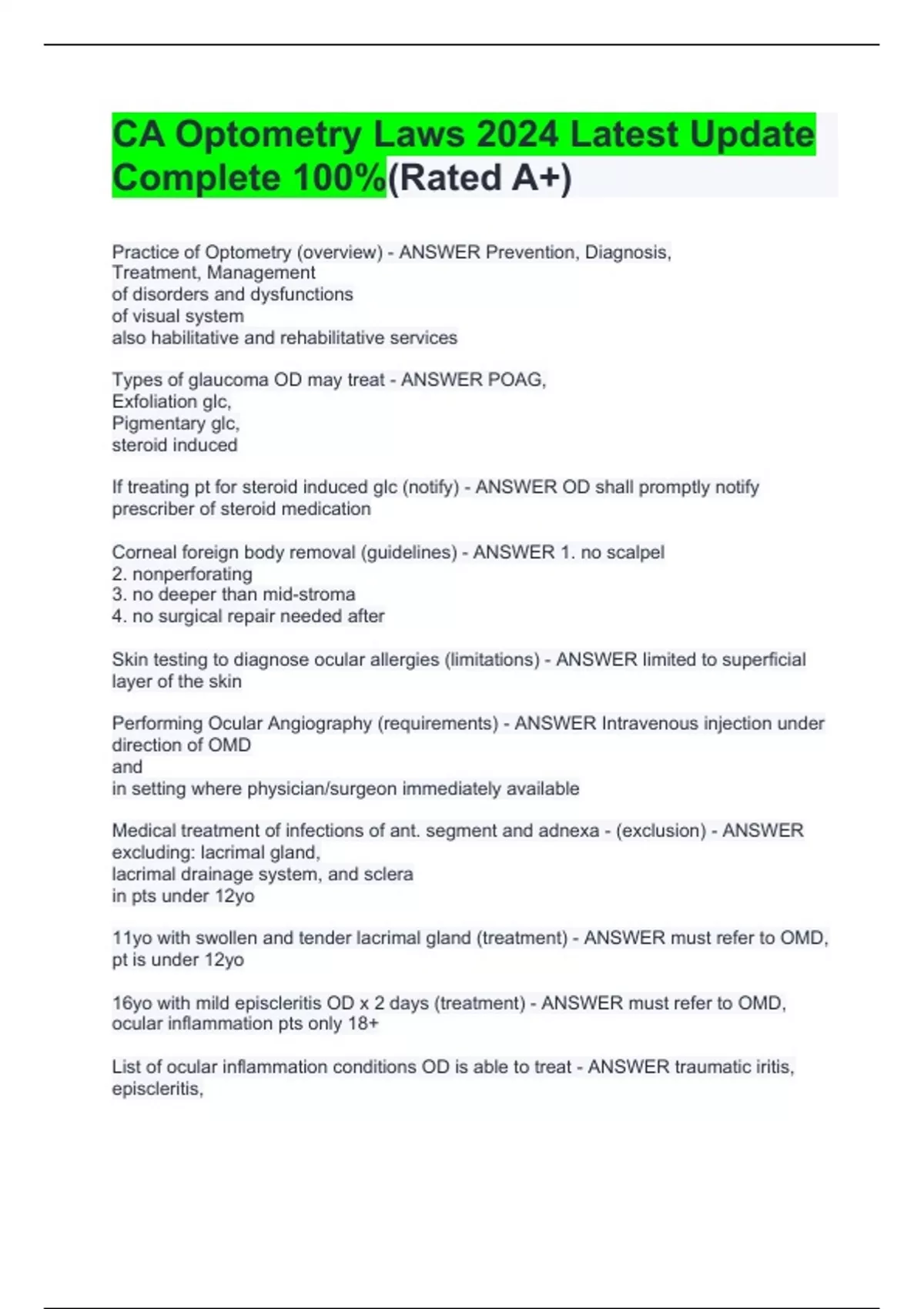 CA Optometry Laws 2024 Latest Update Comple Practice of Optometry (overview) - ANSWER Prevention, Diagnosis, Treatment, Management of disorders and dysfunctions of visual system also habilitative and rehabilitative services Types of glaucoma OD may treat - ANSWER POAG, Exfoliation glc, Pigmentary glc, steroid induced If treating pt for steroid induced glc (notify) - ANSWER OD shall promptly notify prescriber of steroid medication Corneal foreign body removal (guidelines) - ANSWER 1. no scalpel 2. nonperforating 3. no deeper than mid-stroma 4. no surgical repair needed after Skin testing to diagnose ocular allergies (limitations) - ANSWER limited to superficial layer of the skin Performing Ocular Angiography (requirements) - ANSWER Intravenous injection under direction of OMD and in setting where physician/surgeon immediately available Medical treatment of infections of ant. segment and adnexa - (exclusion) - ANSWER excluding: lacrimal gland, lacrimal drainage system, and sclera in pts under 12yo 11yo with swollen and tender lacrimal gland (treatment) - ANSWER must refer to OMD, pt is under 12yo 16yo with mild episcleritis OD x 2 days (treatment) - ANSWER must refer to OMD, ocular inflammation pts only 18+ List of ocular inflammation conditions OD is able to treat - ANSWER traumatic iritis, e te 100%(Rated A+)