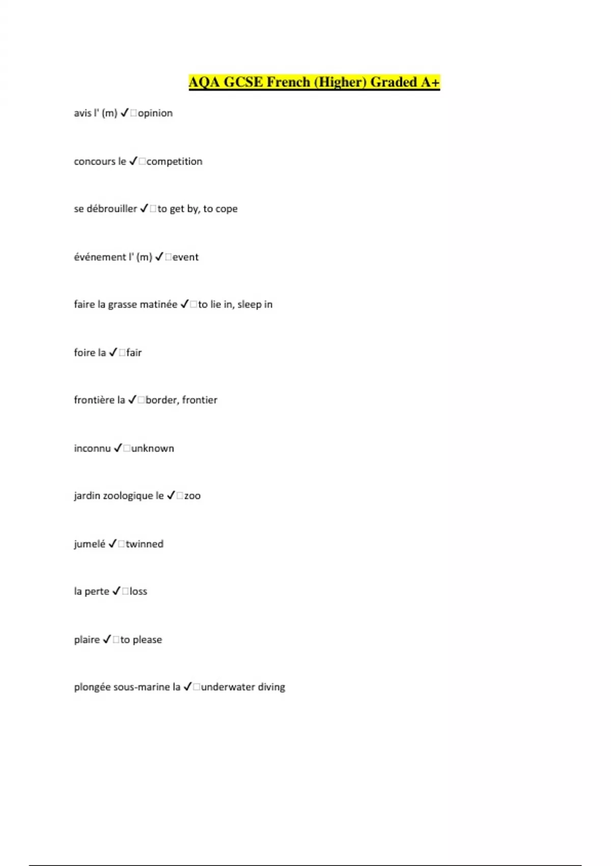 AQA GCSE French (Higher) Graded A+ avis l' (m) ️opinion concours le ️competition se débrouiller ️to get by, to cope événement l' (m) ️event faire la grasse matinée ️to lie in, sleep in foire la ️fair frontière la ️border, frontier inconnu ️unknown jardin zoologique le ️zoo jumelé ️twinned la perte ️loss plaire ️to please plongée sous-marine la ️underwater diving remarquer ️to notice sommet le ️summit station balnéaire la ️seaside resort tour la ️tower, tour traduire ️to translate