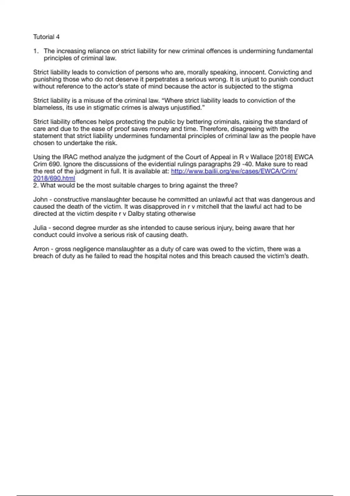 Using the IRAC method analyze the judgment of the Court of Appeal in R v Wallace [2018] EWCA