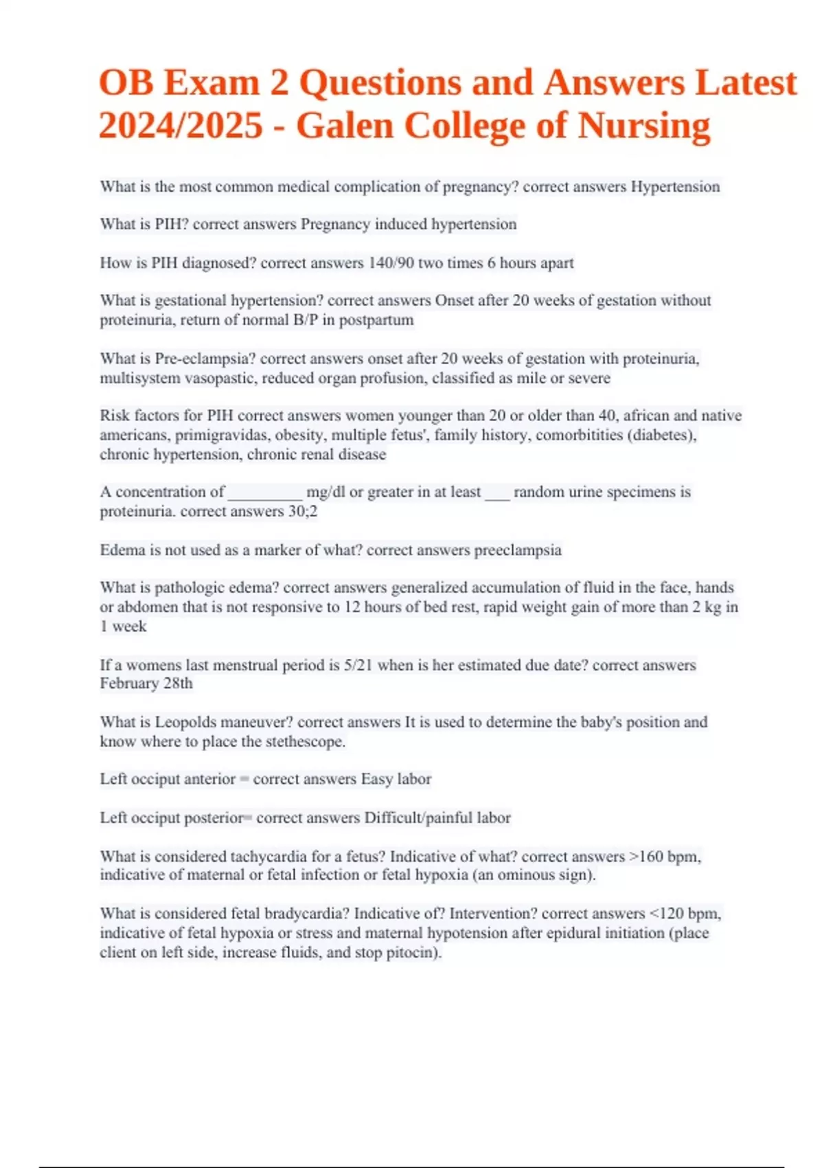 OB Exam 2 Questions and Answers Latest Updated 2024/2025 - Galen College of Nursing