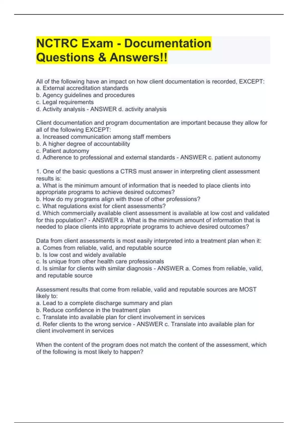 NCTRC Exam - Documentation Questions & Answers!!