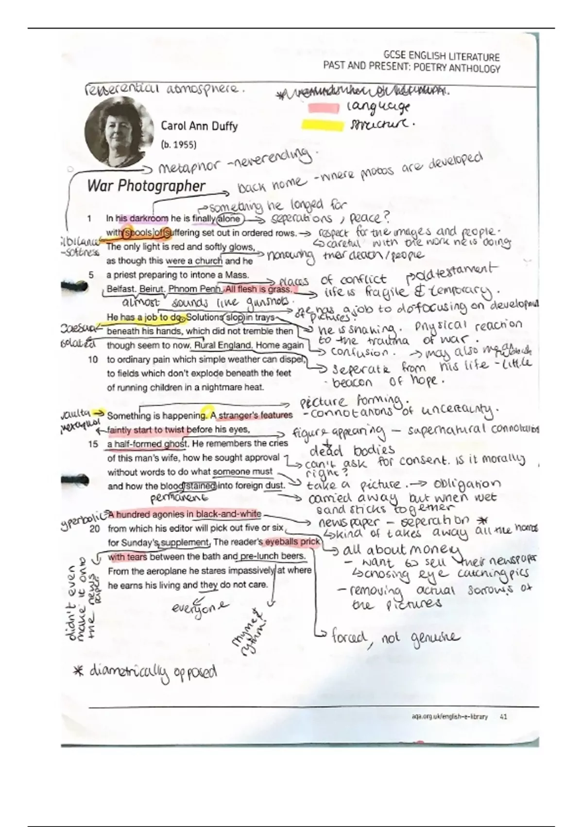 My meticulously structured notes provide a comprehensive analysis of War Photographer, perfect for future exams. Each topic is evaluated and analysed to maximise the chances for top grades. Key concepts are thoroughly examined. These annotations act as a guide to understand the poem, highlighting key methods used by the poet.