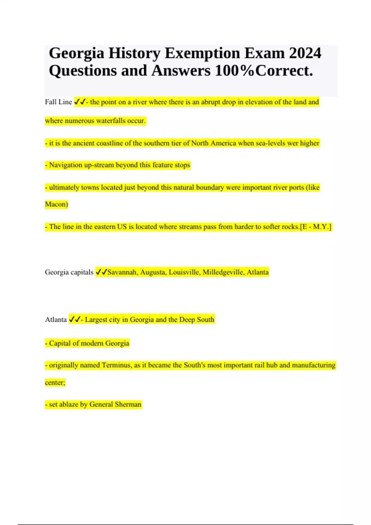 Georgia History Exemption Exam 2024 Questions and Answers 100%Correct. Fall Line - the point on a river where there is an abrupt drop in elevation of the land and where numerous waterfalls occur. - it is the ancient coastline of the southern tier of North America when sea-levels wer higher - Navigation up-stream beyond this feature stops - ultimately towns located just beyond this natural boundary were important river ports (like Macon) - The line in the eastern US is located where streams pass from harder to softer rocks.[E - M.Y.] Georgia capitals Savannah, Augusta, Louisville, Milledgeville, Atlanta Atlanta - Largest city in Georgia and the Deep South - Capital of modern Georgia - originally named Terminus, as it became the South's most important rail hub and manufacturing center; - set ablaze by General Sherman Georgia History Exemption Exam 2024 Questions and Answers 100%Correct. James Wright Georgia's 3rd (and last) Royal Governor. He was extremely popular and successful Indigo, Silk - Brought to GA by Europeans - became a new major cash crop Hernando de Soto Spanish explorer and conquistador who led the first European expedition deep into the modern-day Southeastern United States (Florida, Georgia, Alabama and most likely Arkansas) in 1540, and the first documented European to have crossed the Mississippi River. Salzburgers Some of the first immigrants to the new Georgia colony in the 1730's From Austria came to Georgia to escape religious persecution (they were protestants, not Catholics) settled Ebenezer/New Ebenezer opposed slavery James Oglethorpe Founder of Savannah (1733), and governor of the Georgia colony. He ran a tightly-disciplined, military-like colony. Slaves, alcohol, and Catholicism were forbidden in his colony. Many colonists felt that he was a dictator, and that (along with the colonist's dissatisfaction over not being allowed to own slaves) caused the colony to break down and he to lose his position as governor. Georgia Trustees They gave out land between the Savannah and Altamaha Rivers. They also prohibited having rum and owning African Slaves. Scottish Highlanders - Added protection to GAs southern border - fought with Oglethorpe to fight off the Spanish Fletcher v. Peck (1810) First time the Supreme Court ruled a state law unconstitutional. It protected property rights and allowed the invalidation of state laws that conflicted with the Constitution. Worcester v. Georgia (1832) US Supreme Court (esp. Frank Marshall) held that Cherokee Native Americans were entitled to federal protection from the actions of state governments which would infringe on the tribe's sovereignty. Ignored blatantly by Andrew Jackson Battle of Bloody Marsh In 1742, Oglethorpe's forces, along with help from the Highland Scots, surprised Spanish troops at St. Simon's Is;and and forced them back across the Florida border. This marked the beginning of a safe southern frontier for the British.