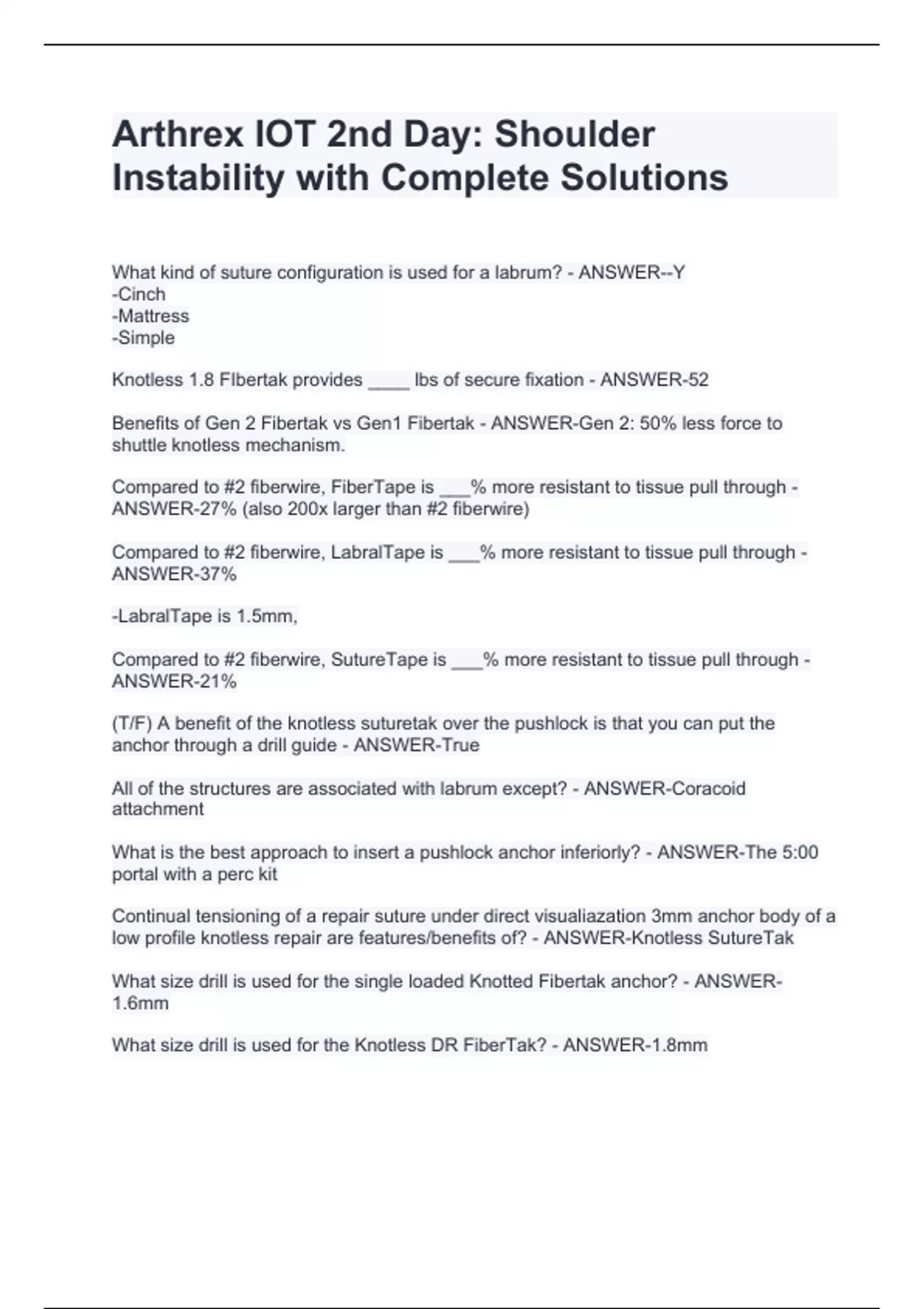 Arthrex IOT 2nd Day: Shoulder Instability with Complete Solutions Arthrex IOT 2nd Day: Shoulder Instability with Complete Solutions Arthrex IOT 2nd Day: Shoulder Instability with Complete Solutions Arthrex IOT 2nd Day: Shoulder Instability with Complete Solutions Arthrex IOT 2nd Day: Shoulder Instability with Complete Solutions What kind of suture configuration is used for a labrum? - ANSWER--Y -Cinch -Mattress -Simple Knotless 1.8 FIbertak provides ____ lbs of secure fixation - ANSWER-52 Benefits of Gen 2 Fibertak vs Gen1 Fibertak - ANSWER-Gen 2: 50% less force to shuttle knotless mechanism.