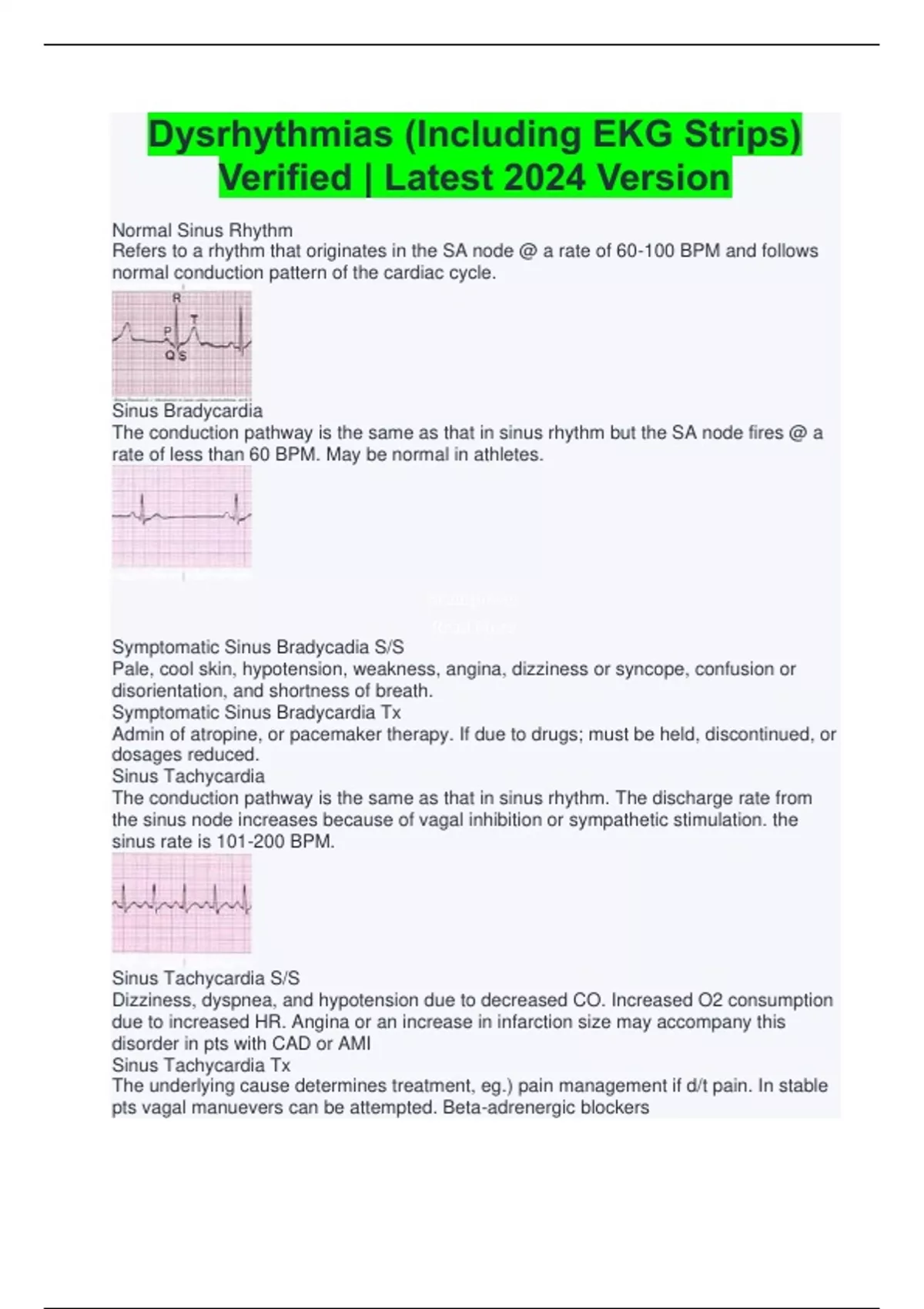 Dysrhythmias (Including EKG Strips) Verified | Latest 2024 Version Normal Sinus Rhythm Refers to a rhythm that originates in the SA node @ a rate of 60-100 BPM and follows normal conduction pattern of the cardiac cycle. Sinus Bradycardia The conduction pathway is the same as that in sinus rhythm but the SA node fires @ a rate of less than 60 BPM. May be normal in athletes. Brainpower Read More Symptomatic Sinus Bradycadia S/S Pale, cool skin, hypotension, weakness, angina, dizziness or syncope, confusion or disorientation, and shortness of breath. Symptomatic Sinus Bradycardia Tx Admin of atropine, or pacemaker therapy. If due to drugs; must be held, discontinued, or dosages reduced. Sinus Tachycardia The conduction pathway is the same as that in sinus rhythm. The discharge rate from the sinus node increases because of vagal inhibition or sympathetic stimulation. the sinus rate is 101-200 BPM. Sinus Tachycardia S/S Dizziness, dyspnea, and hypotension due to decreased CO. Increased O2 consumption due to increased HR. Angina or an increase in infarction size may accompany this disorder in pts with CAD or AMI Sinus Tachycardia Tx The underlying cause determines treatment, eg.) pain management if d/t pain. In stable pts vagal manuevers can be attempted. Beta-adrenergic blockers Atrial Flutter An atrial tachydysrhythmia identified by recurring, regular, sawtooth-shaped flutter waves that originate from a single ectopic focus in the right atrium, less commonly, can occur in left atrium. Atrial Flutter S/S High venticular rate; loss of atrial 'kick'. Decreased CO, HF: esp in pts with underlying heart disease, and increased risk of stroke. Atrial Flutter Tx Coumadin, slow ventricular response by increasing AV block, calcium channel blockers, beta-adrenergic blockers, electrical cardioversion, antidysrhythmia meds, and radiofrequency catheter ablation. Atrial Fibrillation Characterized by a total disorganization of atrial electrical activity due to multiple ectopic foci resulting in loss of effective atrial contraction. May be paroxysmal or persistant (+7 days). Most common dysrhythmia. Atrial Fibrillation S/S Usually occur with underlying heart disease. Decreased CO, thrombi form in atria due to blood stasis, causes 20% of all strokes. Atrial Fibrillation Tx Goals include decreased ventricular repsonse (<100 BPM), prevention of cerebral embolic events, conversion to sinus rhythm possible. Calcium channel blockers, beta- adrenergic blockers, digoxin, dronedarone, electrical cardioversion, antidysrhythmics, coumadin, aspirin, radiofrequency catheter ablation, maze procedure or cryoblation. Premature Ventricular Contractions (PVCs) A contraction originating in an ectopic focus in the ventricles. It is the premature occurence of a QRS complex, which is wide and distorted in shape compared with a QRS complex originated from the normal conduction pathway. PVCs S/S Usually benign in the pt with a normal heart. In heart disease: decreased CO, precipitate angina/HF, indicate ventricular irritability in CAD or AMI, and pulse deficit. PVCs Tx Treatment relates to the underlying cause eg.) O2 therapy for hypoxia. Beta-adrenergic blockers, procainamide, amiodarone, and lidocaine. Multifocal PVCs Arise from different foci and appear different in shape from each other. Unifocal PVCs PVCs have the same shape Ventricular Tachycardia A run of 3 or more PVCs. It occurs when an ectopic focus or foci fire repetively and the ventricle takes control as the pacemaker.