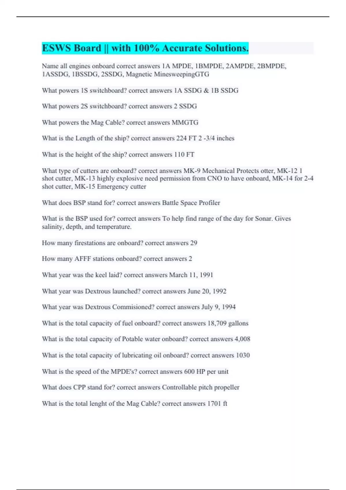 Name all engines onboard correct answers 1A MPDE, 1BMPDE, 2AMPDE, 2BMPDE, 1ASSDG, 1BSSDG, 2SSDG, Magnetic MinesweepingGTG What powers 1S switchboard? correct answers 1A SSDG & 1B SSDG What powers 2S switchboard? correct answers 2 SSDG What powers the Mag Cable? correct answers MMGTG What is the Length of the ship? correct answers 224 FT 2 -3/4 inches What is the height of the ship? correct answers 110 FT What type of cutters are onboard? correct answers MK-9 Mechanical Protects otter, MK-12 1 shot cutter, MK-13 highly explosive need permission from CNO to have onboard, MK-14 for 2-4 shot cutter, MK-15 Emergency cutter What does BSP stand for? correct answers Battle Space Profiler What is the BSP used for? correct answers To help find range of the day for Sonar. Gives salinity, depth, and temperature. How many firestations are onboard? correct answers 29 How many AFFF stations onboard? correct answers 2 What year was the keel laid? correct answers March 11, 1991 What year was Dextrous launched? correct answers June 20, 1992 What year was Dextrous Commisioned? correct answers July 9, 1994 What is the total capacity of fuel onboard? correct answers 18,709 gallons What is the total capacity of Potable water onboard? correct answers 4,008 What is the total capacity of lubricating oil onboard? correct answers 1030 What is the speed of the MPDE's? correct answers 600 HP per unit What does CPP stand for? correct answers Controllable pitch propeller What is the total lenght of the Mag Cable? correct answers 1701 ft