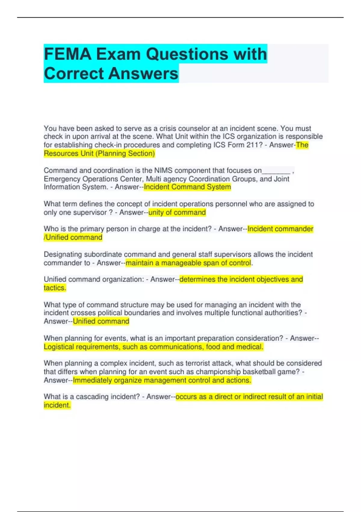 FEMA Exam Questions with Correct Answers You have been asked to serve as a crisis counselor at an incident scene. You must check in upon arrival at the scene. What Unit within the ICS organization is responsible for establishing check-in procedures and completing ICS Form 211? - Answer-The Resources Unit (Planning Section) Command and coordination is the NIMS component that focuses on_______ , Emergency Operations Center, Multi agency Coordination Groups, and Joint Information System. - Answer--Incident Command System What term defines the concept of incident operations personnel who are assigned to only one supervisor ? - Answer--unity of command Who is the primary person in charge at the incident? - Answer--Incident commander /Unified command Designating subordinate command and general staff supervisors allows the incident commander to - Answer--maintain a manageable span of control. Unified command organization: - Answer--determines the incident objectives and tactics. What type of command structure may be used for managing an incident with the incident crosses political boundaries and involves multiple functional authorities? - Answer--Unified command When planning for events, what is an important preparation consideration? - Answer--Logistical requirements, such as communications, food and medical.