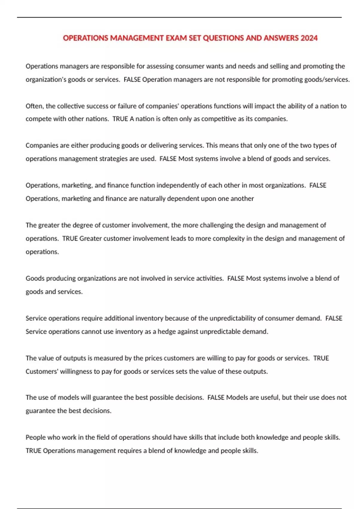 OPERATIONS MANAGEMENT EXAM SET QUESTIONS AND ANSWERS 2024 Operations managers are responsible for assessing consumer wants and needs and selling and promoting the organization's goods or services. FALSE Operation managers are not responsible for promoting goods/services. Often, the collective success or failure of companies' operations functions will impact the ability of a nation to compete with other nations. TRUE A nation is often only as competitive as its companies. Companies are either producing goods or delivering services. This means that only one of the two types of operations management strategies are used. FALSE Most systems involve a blend of goods and services. Operations, marketing, and finance function independently of each other in most organizations. FALSE Operations, marketing and finance are naturally dependent upon one another The greater the degree of customer involvement, the more challenging the design and management of operations. TRUE Greater customer involvement leads to more complexity in the design and management of operations.