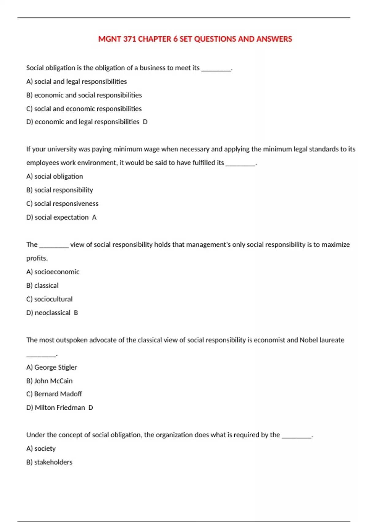 MGNT 371 CHAPTER 6 SET QUESTIONS AND ANSWERS Social obligation is the obligation of a business to meet its ________. A) social and legal responsibilities B) economic and social responsibilities C) social and economic responsibilities D) economic and legal responsibilities D If your university was paying minimum wage when necessary and applying the minimum legal standards to its employees work environment, it would be said to have fulfilled its ________. A) social obligation B) social responsibility C) social responsiveness D) social expectation A The ________ view of social responsibility holds that management's only social responsibility is to maximize profits. A) socioeconomic B) classical C) sociocultural D) neoclassical B The most outspoken advocate of the classical view of social responsibility is economist and Nobel laureate ________. A) George Stigler B) John McCain C) Bernard Madoff D) Milton Friedman D Under the concept of social obligation, the organization does what is required by the ________. A) society B) stakeholders C) environment D) law D The ________ view is that management's social responsibility goes beyond making profits to include protecting and improving society's welfare. A) sociotechnical B) socioeconomic C) sociocultural D) sociopolitical B When a firm advertises that it only uses recycled paper products, it is ________. A) meeting its social obligation B) meeting its social screening requirements C) being socially responsive D) following ISO 9000 standards C