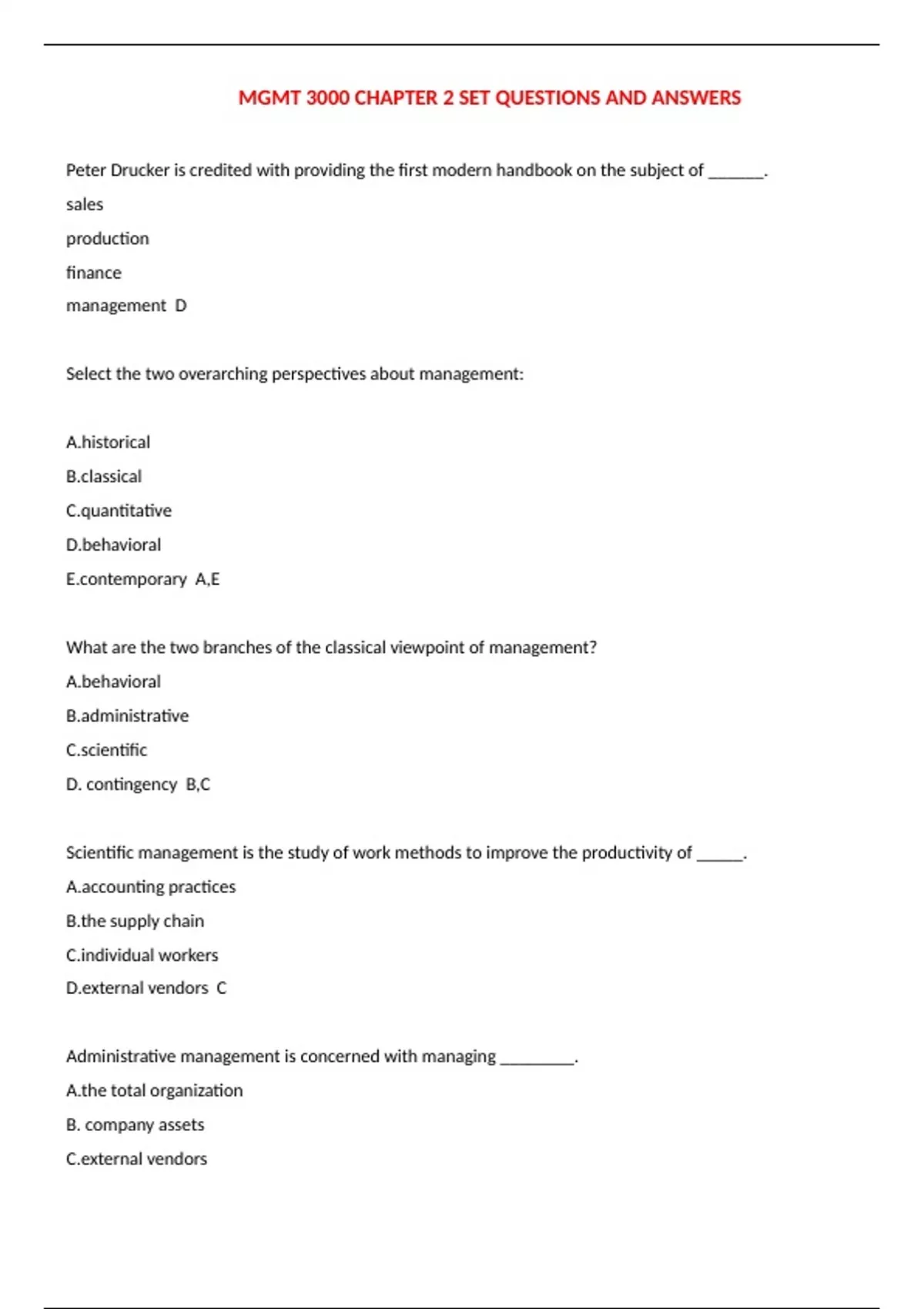 MGMT 3000 CHAPTER 2 SET QUESTIONS AND ANSWERS Peter Drucker is credited with providing the first modern handbook on the subject of ______. sales production finance management D Select the two overarching perspectives about management: A.historical B.classical C.quantitative D.behavioral E.contemporary A,E What are the two branches of the classical viewpoint of management? A.behavioral B.administrative C.scientific D. contingency B,C Scientific management is the study of work methods to improve the productivity of _____. A.accounting practices B.the supply chain C.individual workers D.external vendors C Administrative management is concerned with managing ________. A.the total organization B. company assets C.external vendors D.individual workers A Which of these statements represent ideas that Peter Drucker introduced in his book The Practice of Management? (select all that apply) A. Production costs are a component of sales B.Charismatic leaders are more important than management practices C.Employees should be treated as assets D. A corporation can be thought of as a human community E. Without customers, businesses wouldn't exist C,D,E Charles Clinton Spaulding, one of the pioneering theorists of administrative management, proposed eight _____ of management based in part on his childhood experiences working at his father's fields. A. foundations B. necessities C. considerations D. fundamentals B