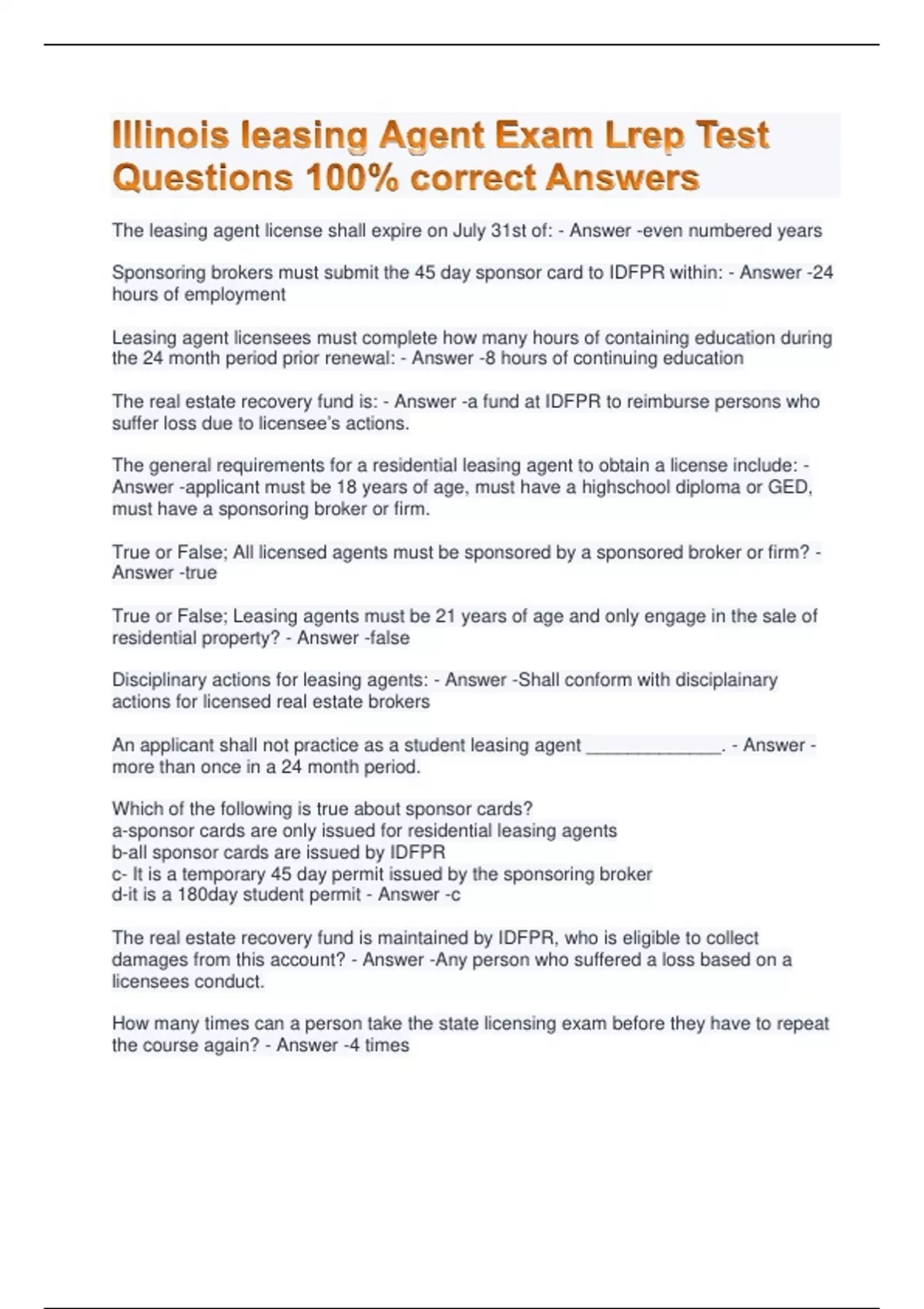 Illinois Leasing agent exam prep Test Questions 100% Correct Answers The leasing agent license shall expire on July 31st of: - Answer -even numbered years Sponsoring brokers must submit the 45 day sponsor card to IDFPR within: - Answer -24 hours of employment Leasing agent licensees must complete how many hours of containing education during the 24 month period prior renewal: - Answer -8 hours of continuing education The real estate recovery fund is: - Answer -a fund at IDFPR to reimburse persons who suffer loss due to licensee’s actions. The general requirements for a residential leasing agent to obtain a license include: - Answer -applicant must be 18 years of age, must have a highschool diploma or GED, must have a sponsoring broker or firm. True or False; All licensed agents must be sponsored by a sponsored broker or firm? - Answer -true True or False; Leasing agents must be 21 years of age and only engage in the sale of residential property? - Answer -false Disciplinary actions for leasing agents: - Answer -Shall conform with disciplainary actions for licensed real estate brokers An applicant shall not practice as a student leasing agent _____________. - Answer -more than once in a 24 month period. Which of the following is true about sponsor cards? a-sponsor cards are only issued for residential leasing agents b-all sponsor cards are issued by IDFPR c- It is a temporary 45 day permit issued by the sponsoring broker d-it is a 180day student permit - Answer -c The real estate recovery fund is maintained by IDFPR, who is eligible to collect damages from this account? - Answer -Any person who suffered a loss based on a licensees conduct. How many times can a person take the state licensing exam before they have to repeat the course again? - Answer -4 times the IDFPR requires escrow records to be maintained by the sponsoring broker: - Answer -5 years When must escrow money be deposited by the sponsoring broker? - Answer -No later than the next business day following the transaction. Where is the original license for a leasing agent kept? - Answer -In the sponsoring brokers principal office Mary is sponsoring broker, she was found guilty of a license act violation. Her license was suspended. What is the status of the licenses that were sponsored by Mary? - Answer -All sponsored licensees immediately go into inactive status. Which of the following is not a blind ad? - Answer -An advertisement for rental property with the brokerage company name and phone number listed on the ad. A licensee seeking an apartment encountered discrimination based on his age. Which one of the following statements is correct regarding the real estate recovery fund? a- the licensee may not file a complaint with IDFPR because of the real estate recovery fund is for members of the general public and not licensees. b- the licensee may not file a complaint because there is no witness to the discrimination when the licensee claims that discrimination took place c-the licensee may file a complaint and a hearing will be conducted by IDFPR to determine if any discrimination took place d- the licensee may file a complaint with IDFPR because the discrimination took place five years ago and the case was opened within the required time period. - Answer -c A licensee owns 1% of a residential property that is being advertised for rent. What is the maximum amount of ownership that a license you can have any property before disclosure is required? - Answer -There is no minimum or maximum percentage of ownership that is required. A student leasing agent was hired on January 15. The sponsoring broker did not complete the 120 day student permit until January 30. When does the 120 day period begin? - Answer -The permit begins the day of the sponsoring broker completes the 120 day permit online and IDFPR.