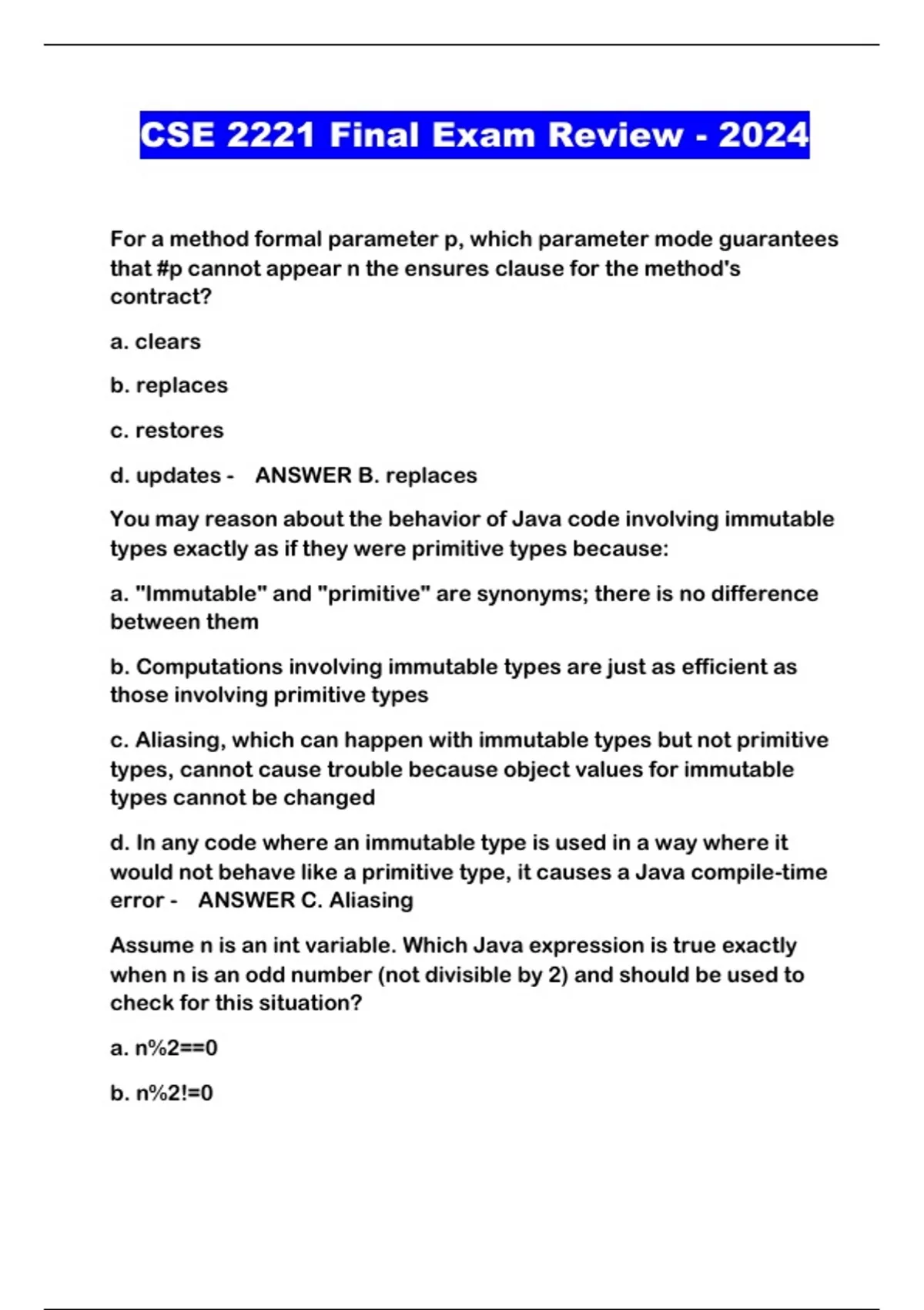 CSE 2221 Final Exam Review - 2024...
